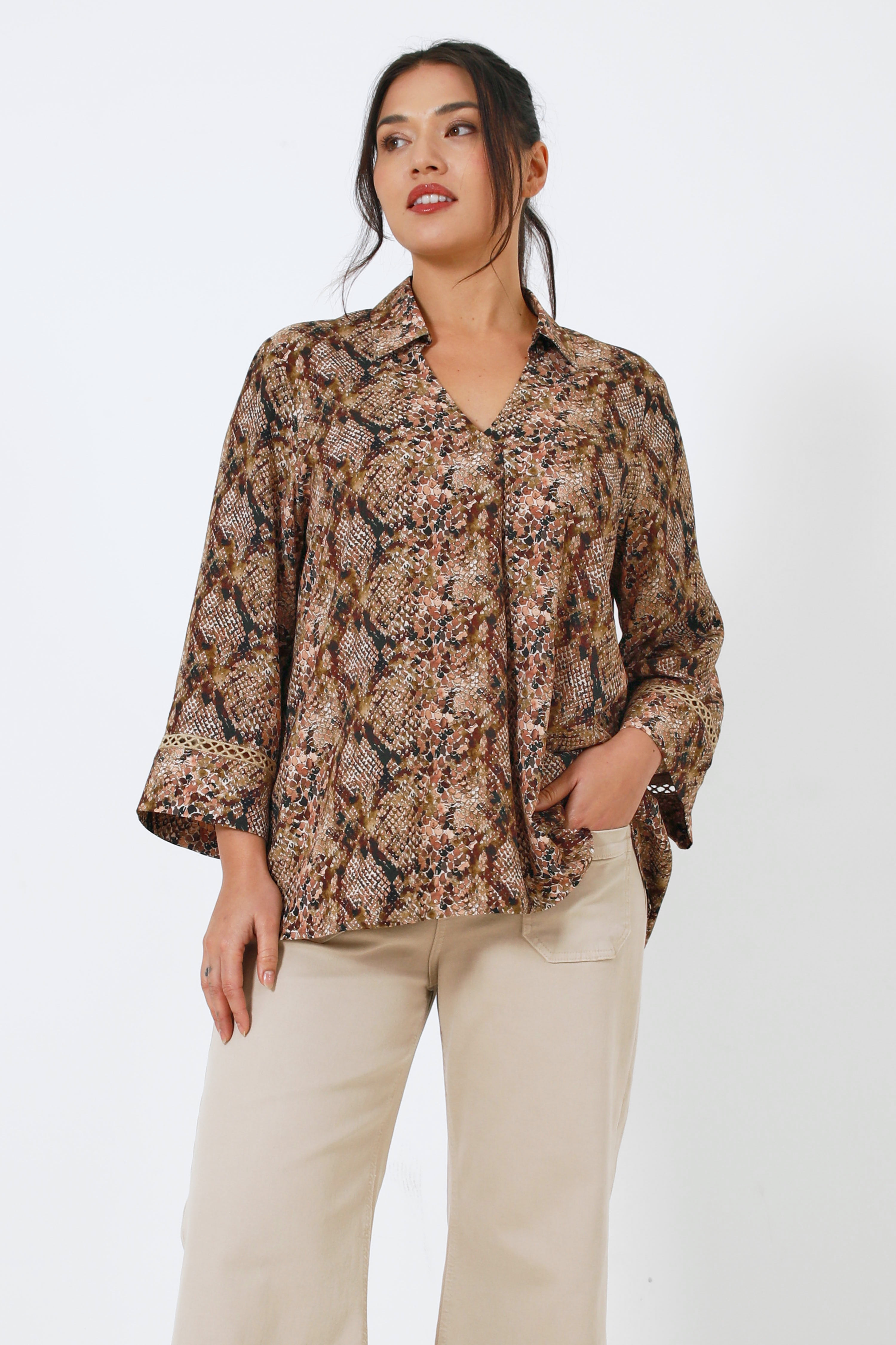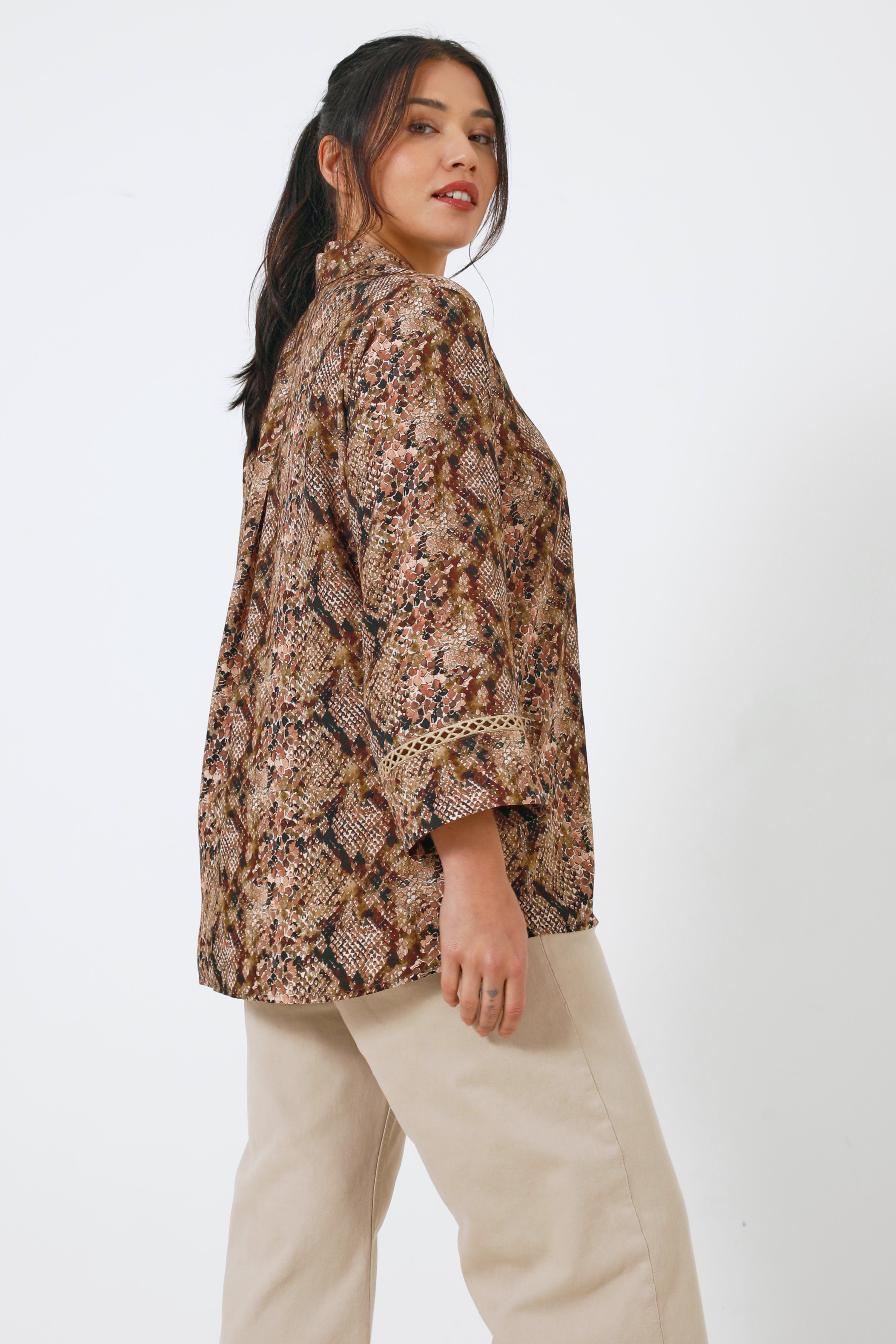 • ¾ sleeve finished with a large cutout bordered with macramé braid.