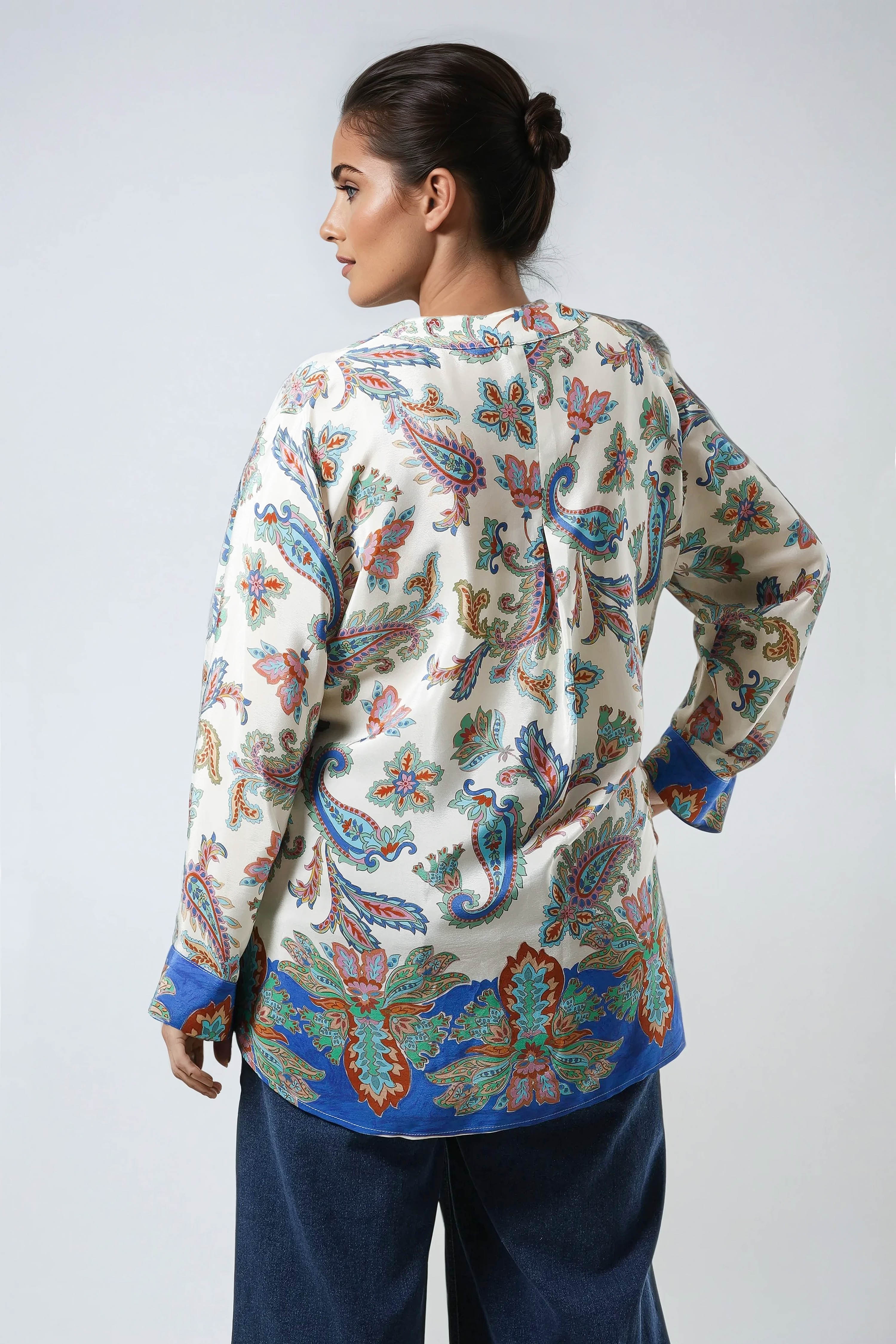Printed blouse with a satin-effect base in ultra-fluid eco-friendly viscose, made in France