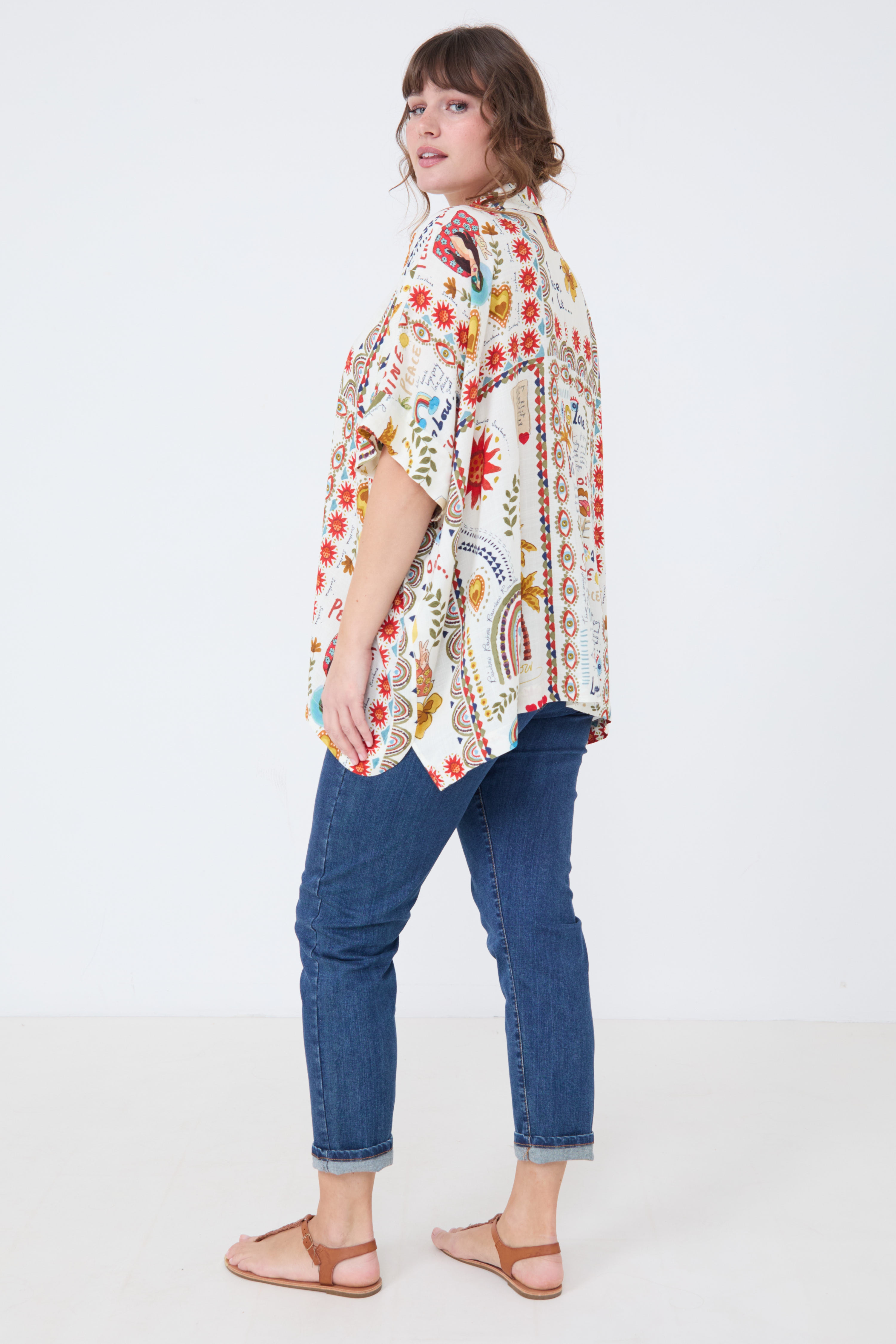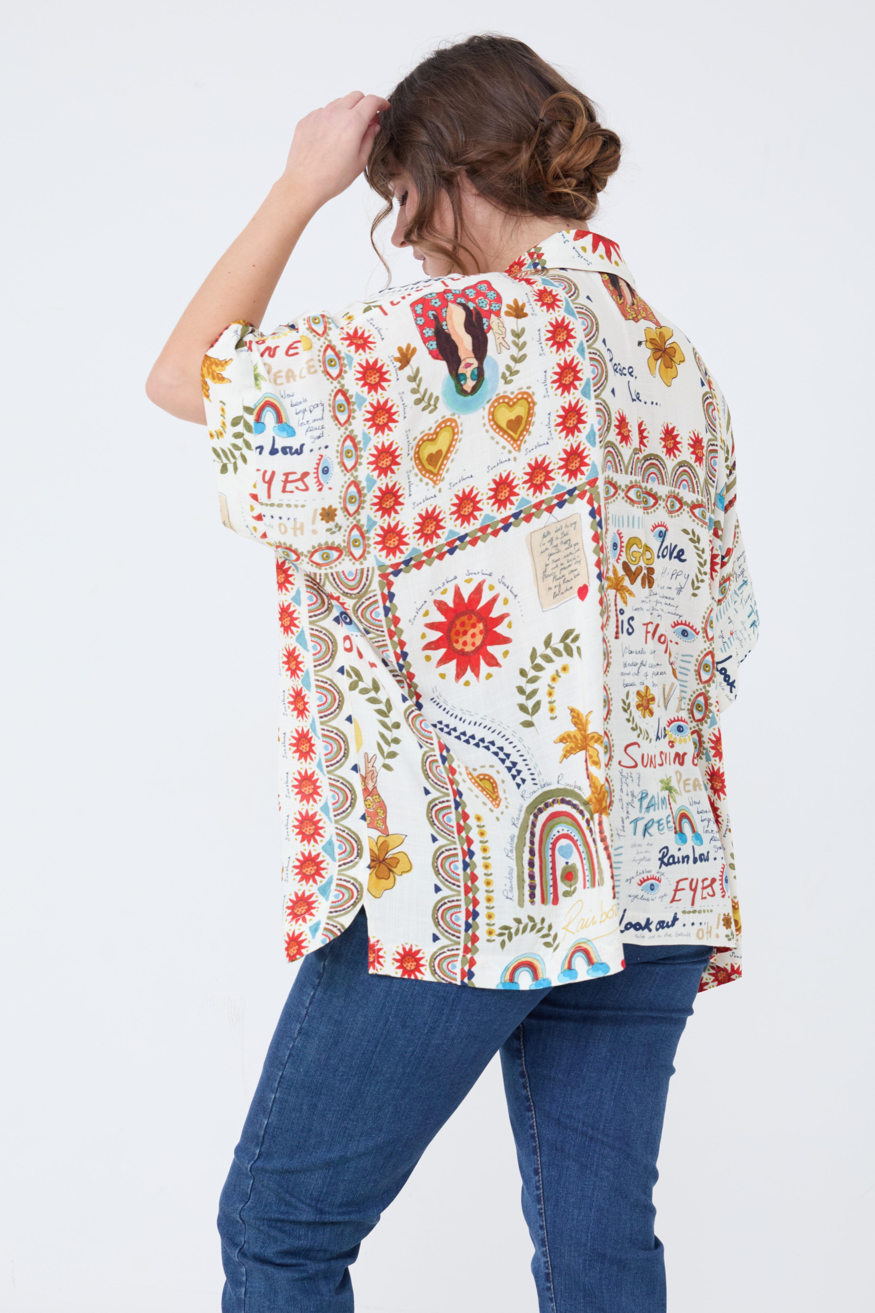 Show off your values in style with this Peace & Love print shirt. Its vibrant, committed pattern combines peace symbols, flowers, and hearts in a bold, bohemian feel. Made from a flowing, pleasant-to-the-touch fabric, it features a straight cut, 3/4 sleeves, and a fully buttoned closure.
