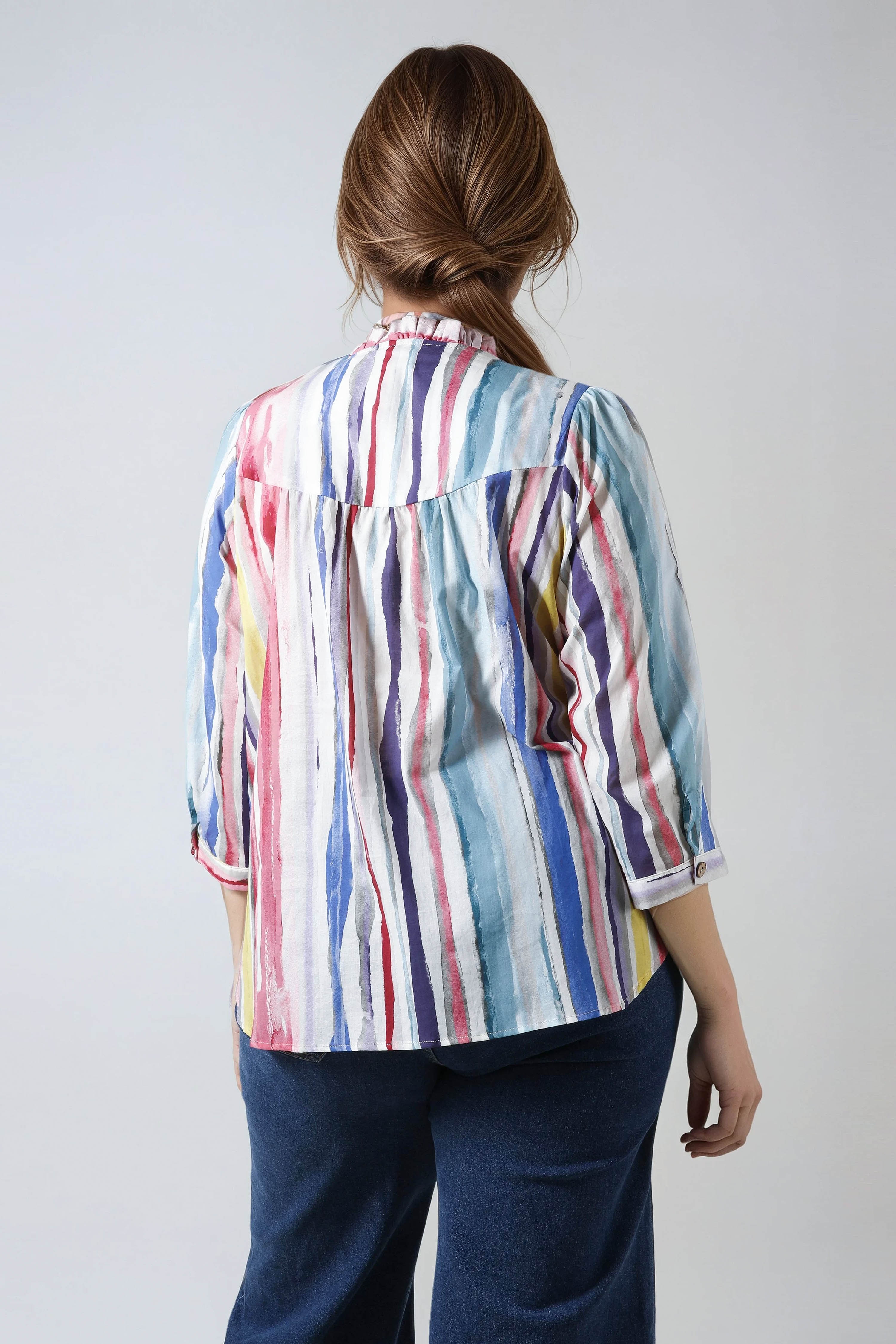 • Small ruffle forming the collar with a tie finished with a pearl.