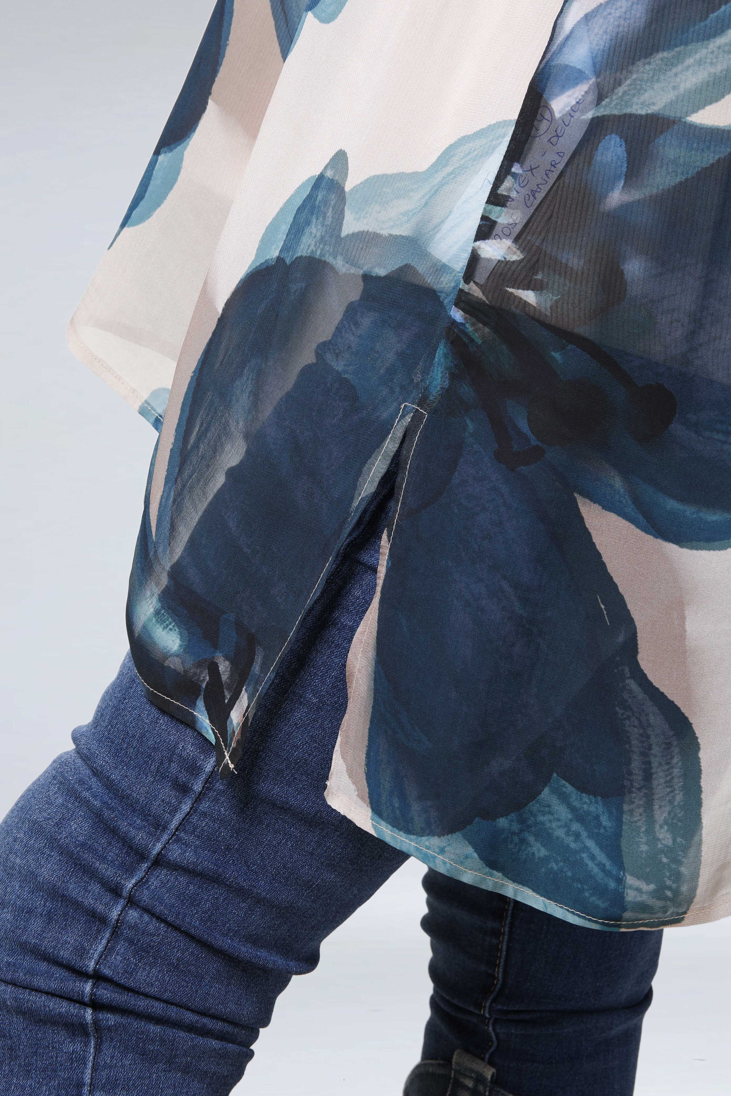 • Tunic in voile printed with a large flower motif.
