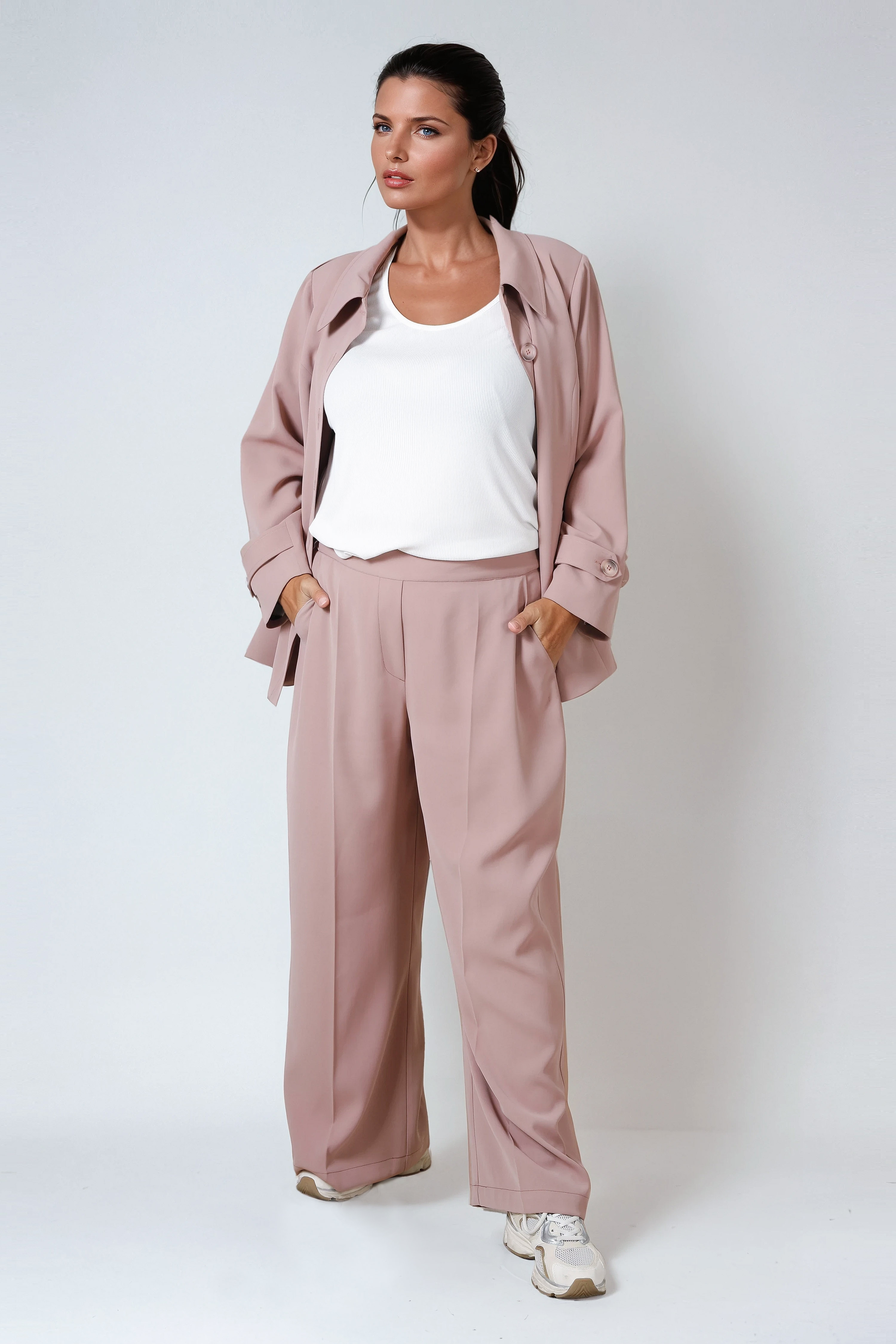 Discover these magnificent tailored trousers in a delicate powder shade.