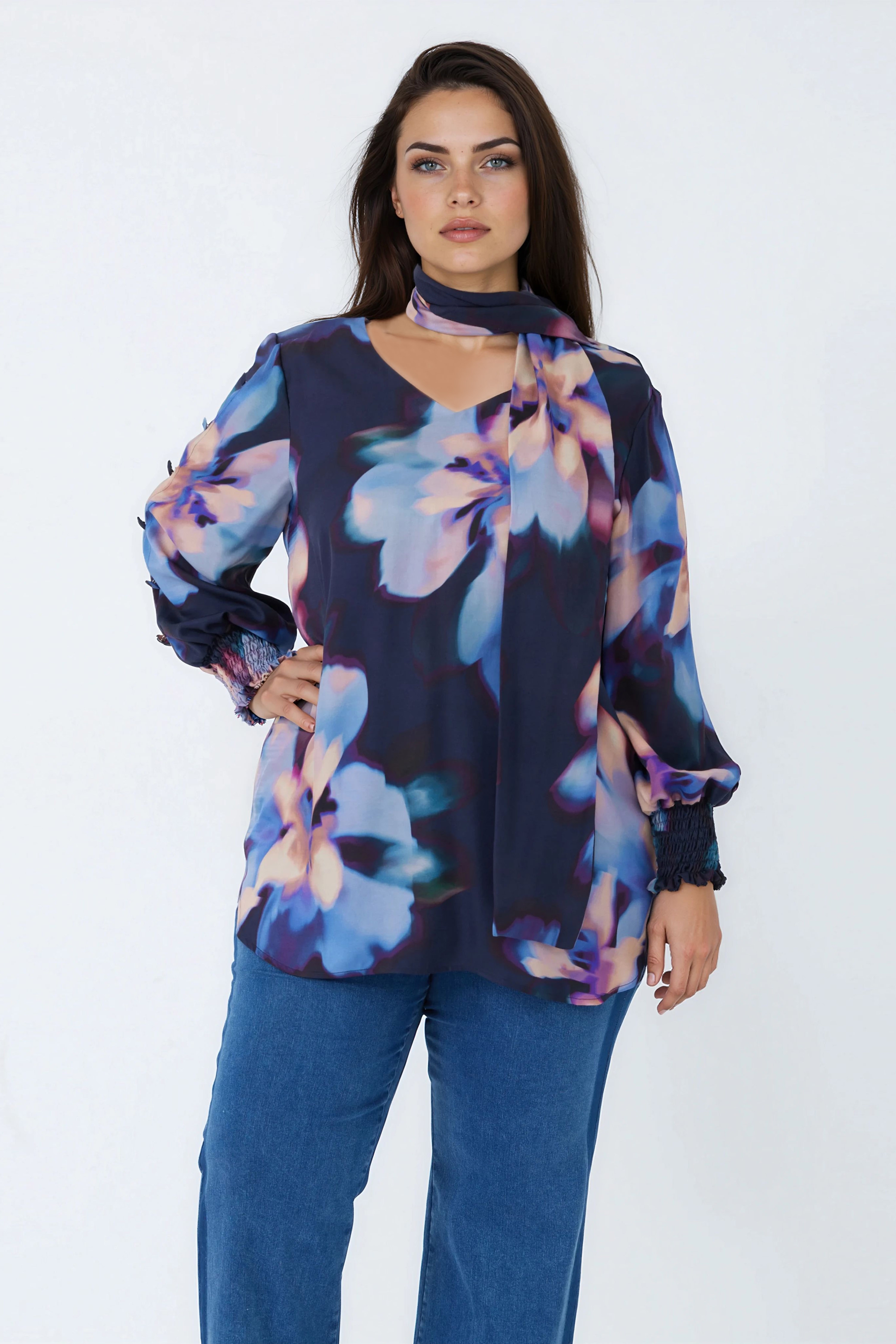 We love its loose fit which ensures comfort and elegance, its long puff sleeves gathered at the wrists, and its integrated scarf to tie as you wish — in a lavallière, in a knot or left free for a chic casual effect.
