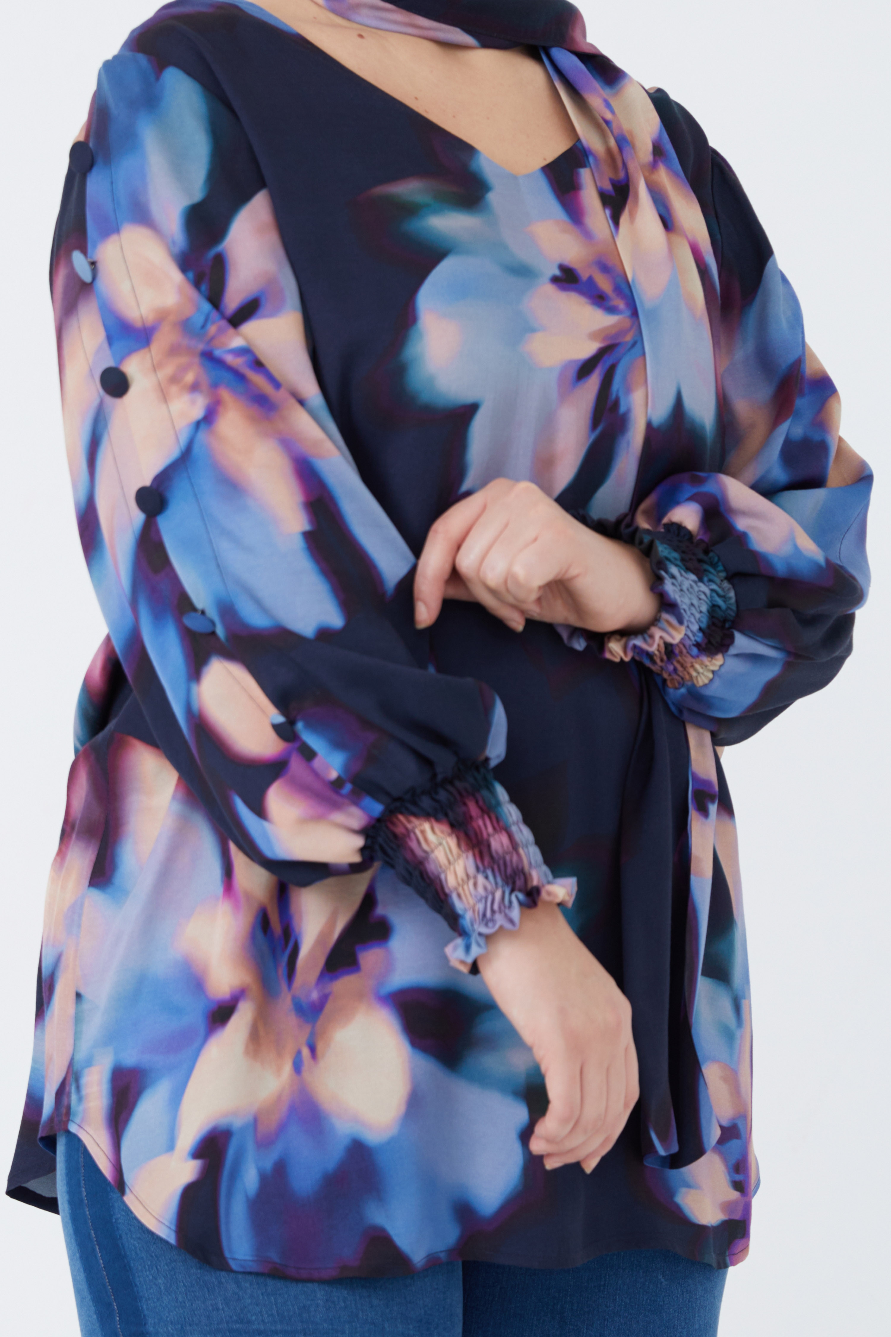 Its floral print in shades of blue and purple adds an artistic and luminous touch to your silhouette.