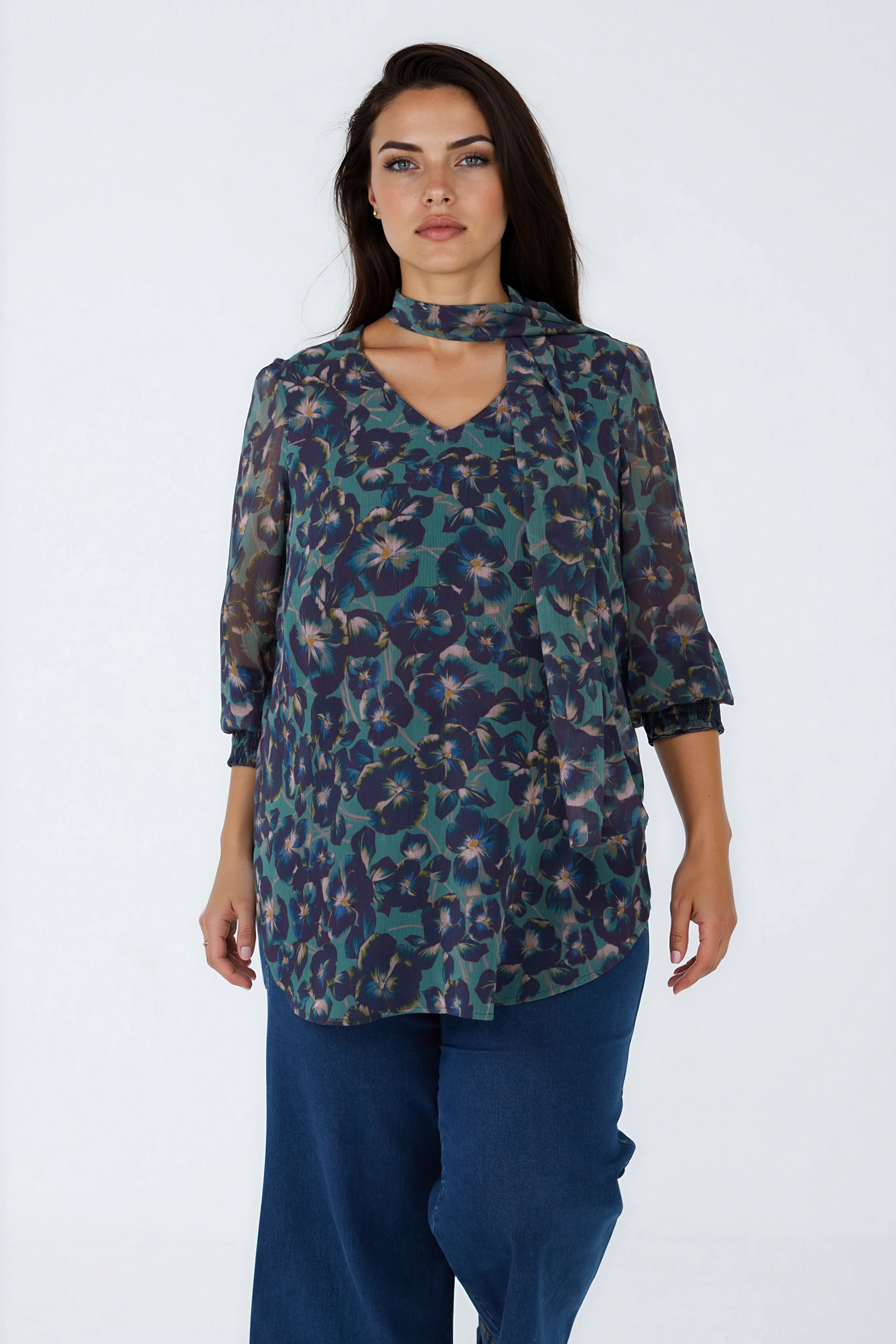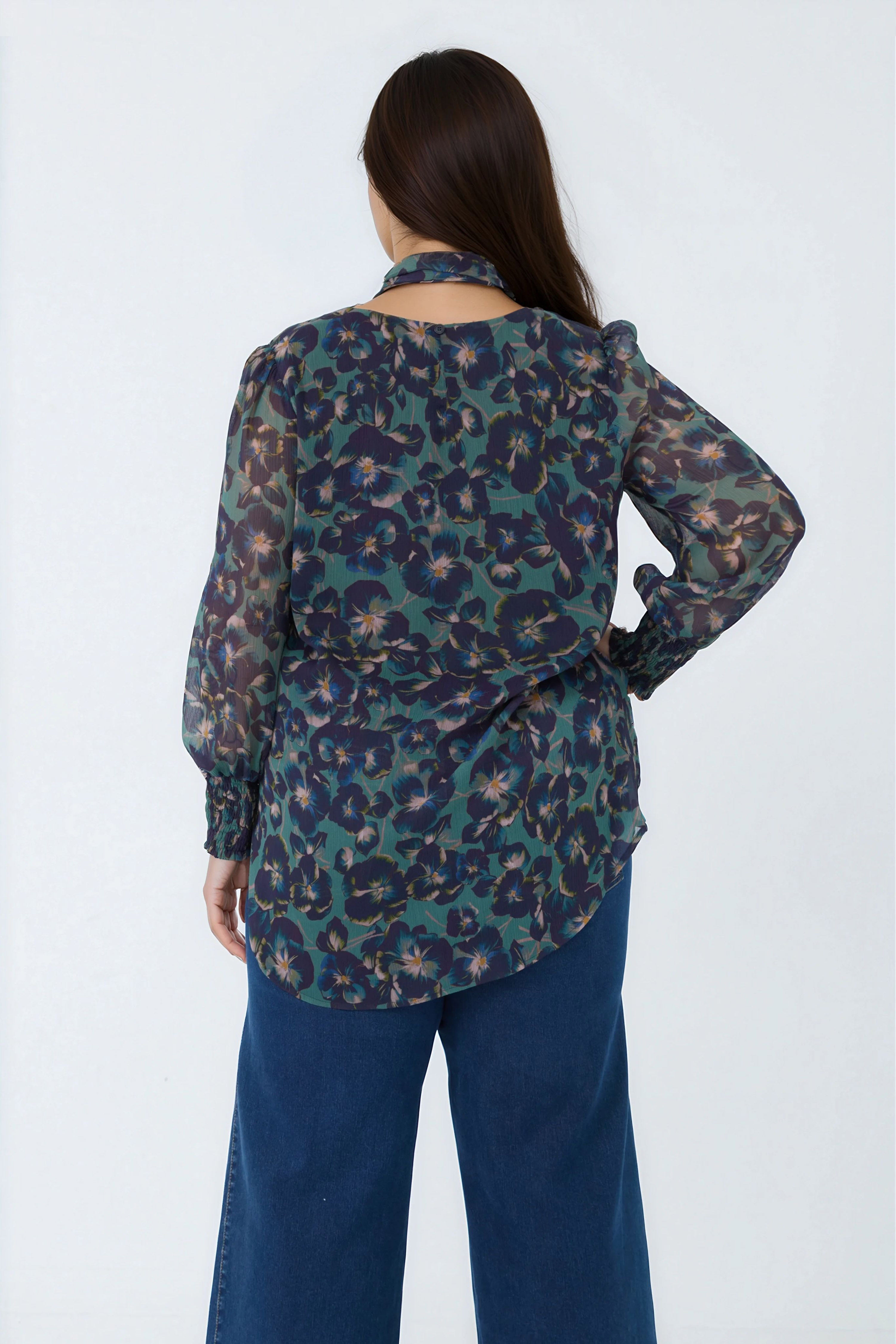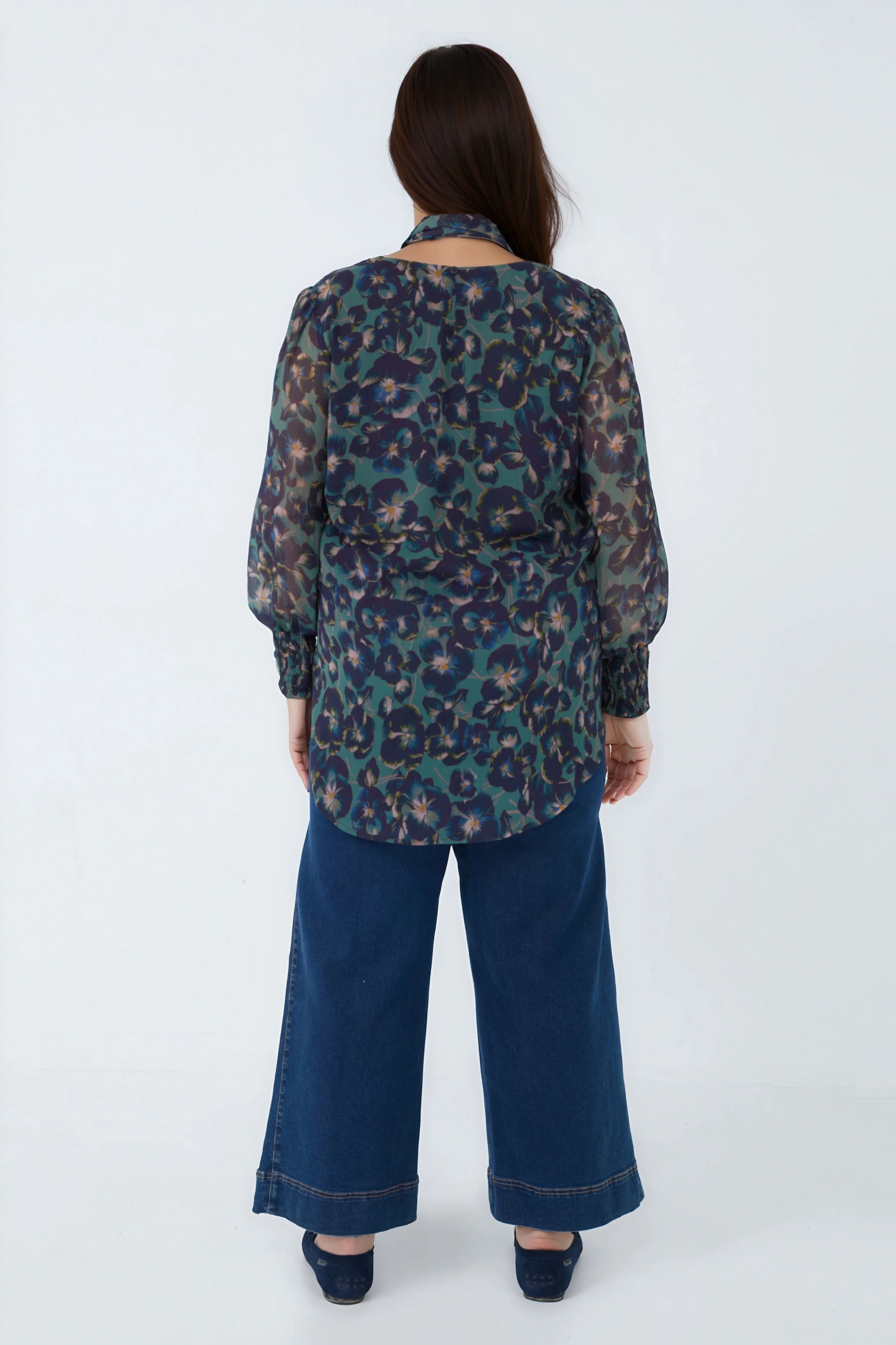 This fluid viscose shirt is appealing thanks to its refined floral print in deep shades of blue and green, enhanced by sheer voile sleeves that bring lightness and femininity.