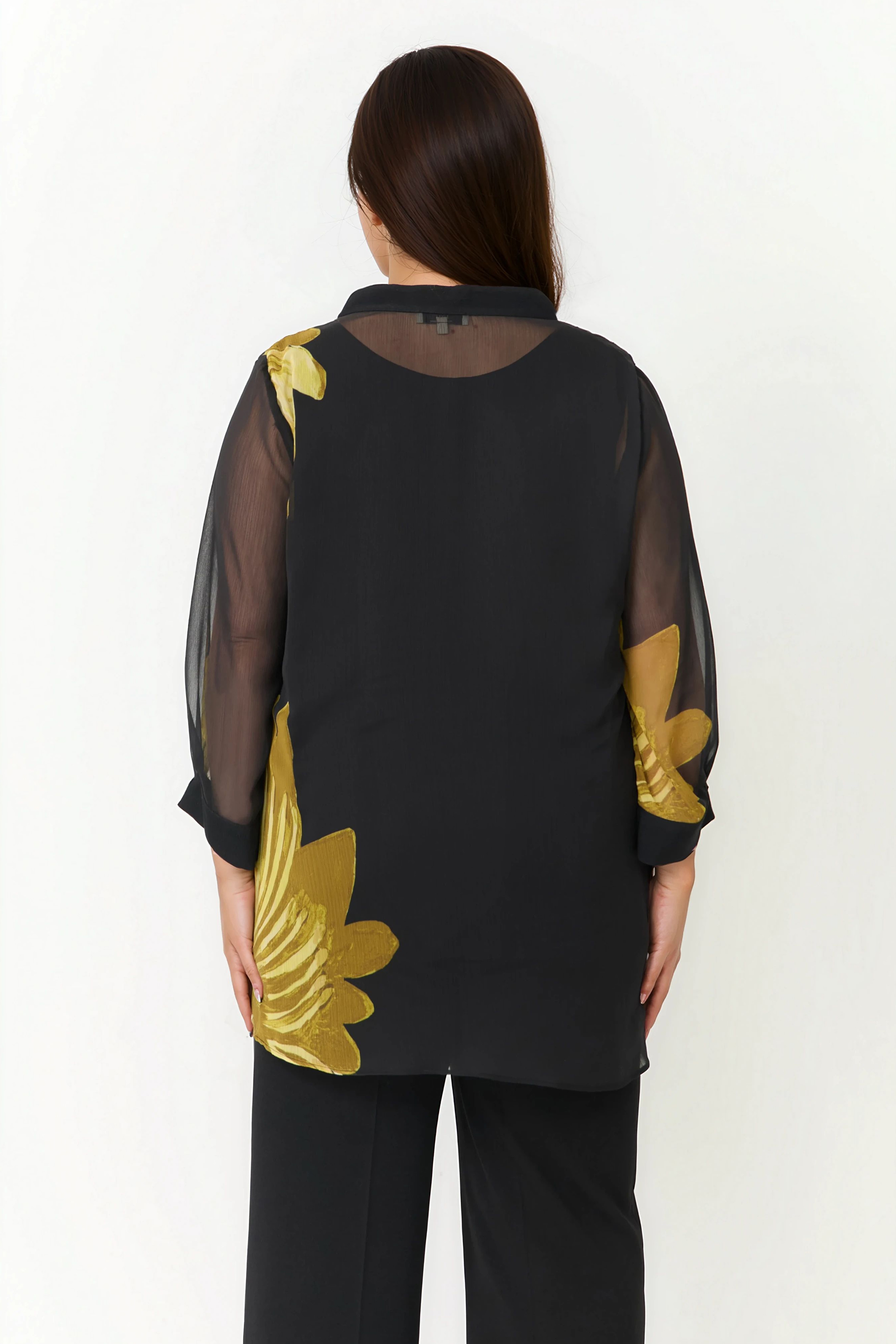 The tunic, flowing and slightly sheer, offers an elegant drape without clinging. Its airy three-quarter sleeves and split neckline delicately accentuate the décolletage. The soft, stretchy black top provides support, comfort, and opacity.