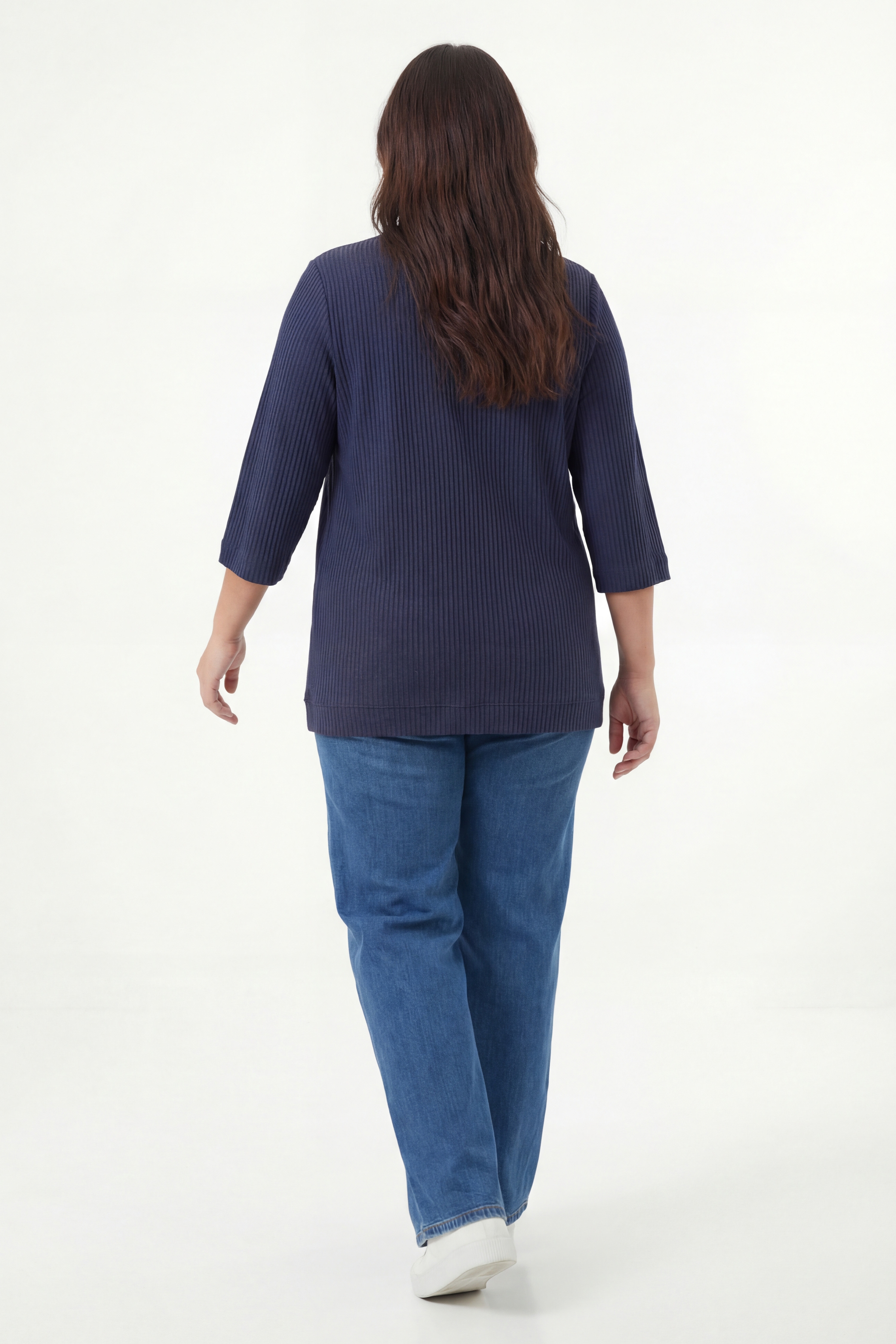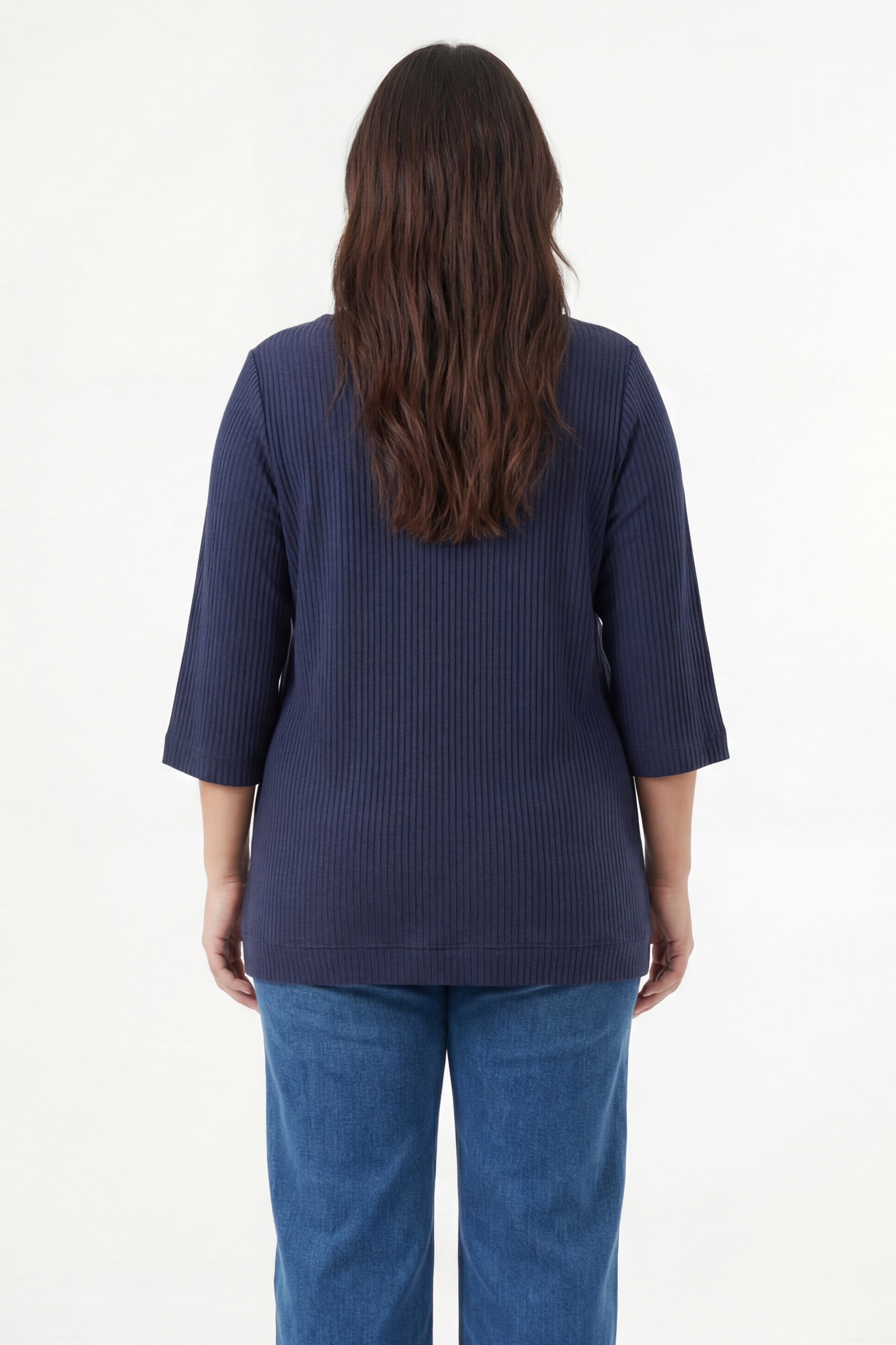 Its feminine rounded neckline, three-quarter sleeves, and vertical ribbed knit visually lengthen the silhouette while offering a natural drape. Comfortable to wear from morning to night, it pairs equally well with jeans or dressier trousers.*