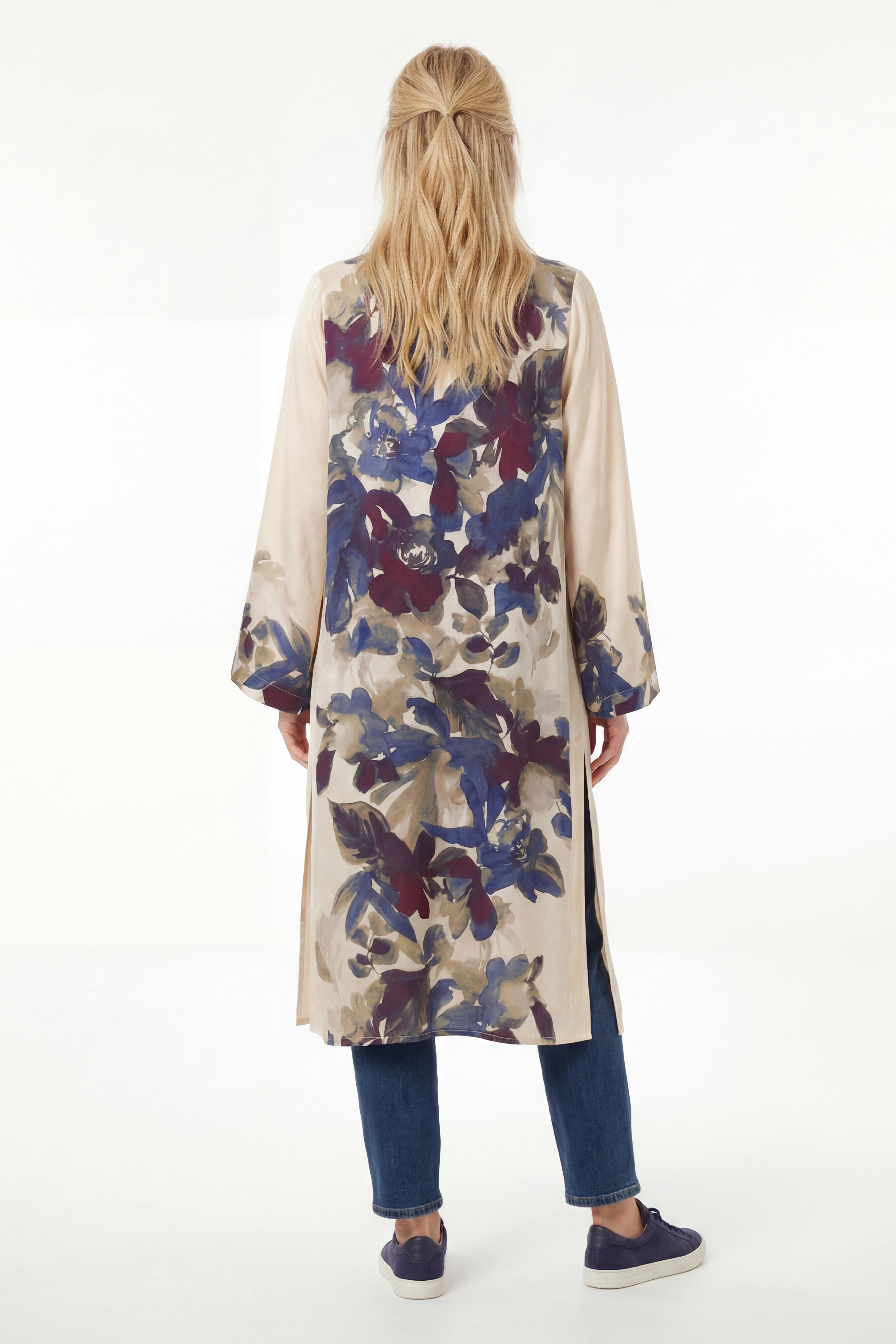 Its straight, open cut elongates the silhouette and suits all body types. The slightly flared long sleeves and printed details on the front add refinement and a modern touch.