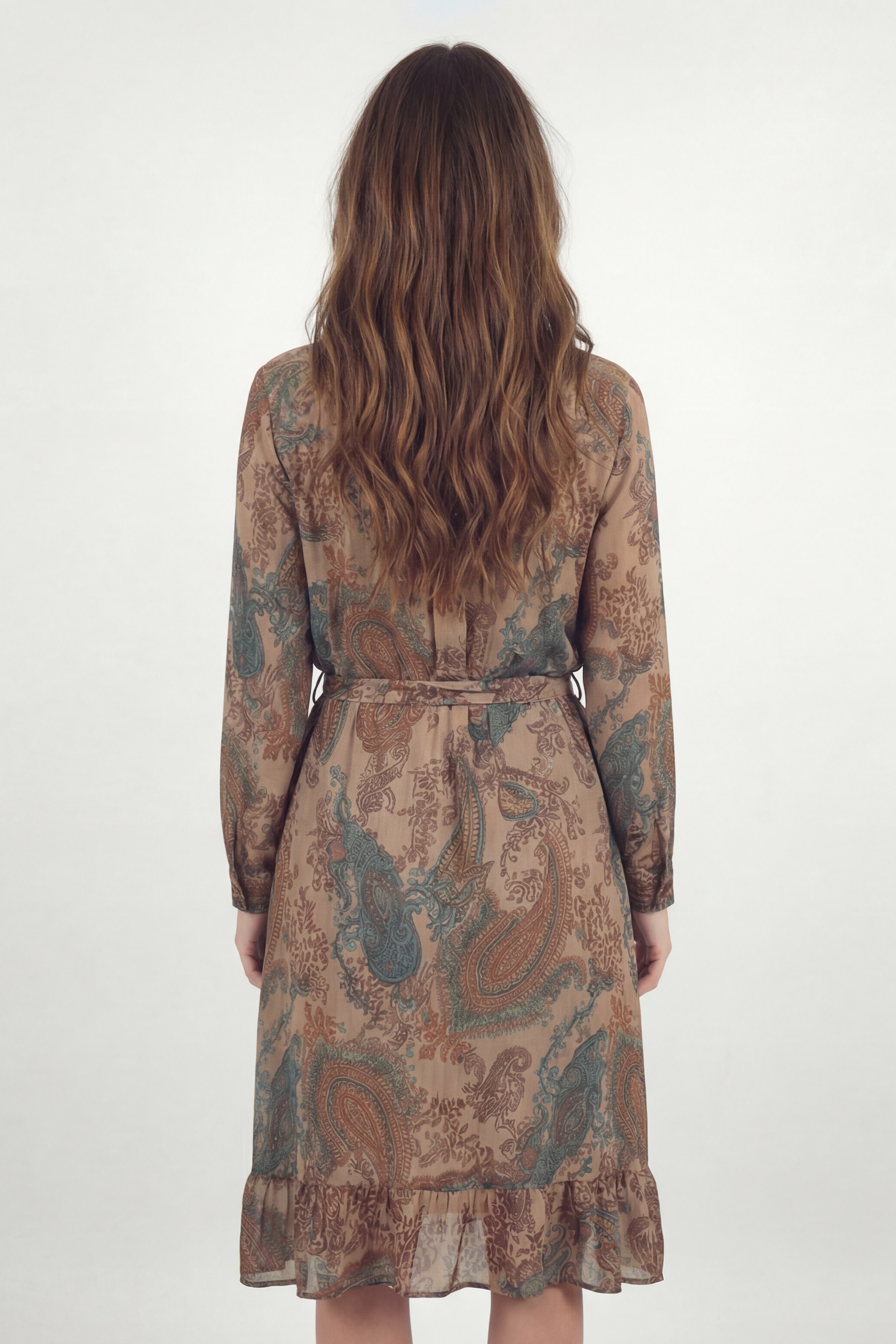 This shirt dress is appealing thanks to its refined paisley print in shades of sand, brown and petrol blue, offering a look that is both chic and natural.