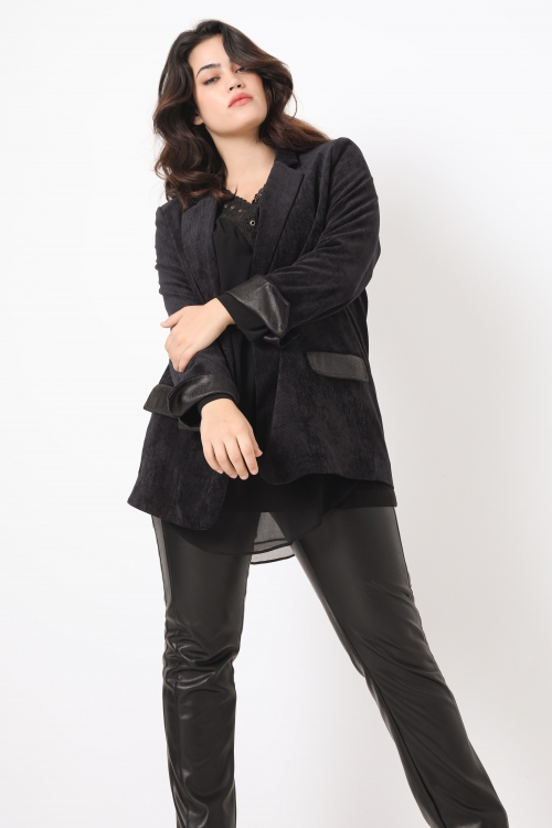 Add a touch of modern elegance to your outfits with this long jacket in solid suede scuba. Comfortable and chic, it stands out with its metal eyelet details on the collar and its soft-touch suede finish, for a refined style in all simplicity. Studded on the middle front. pocket in the cutout on the front. Round neckline. Without buttoning. Long sleeve.