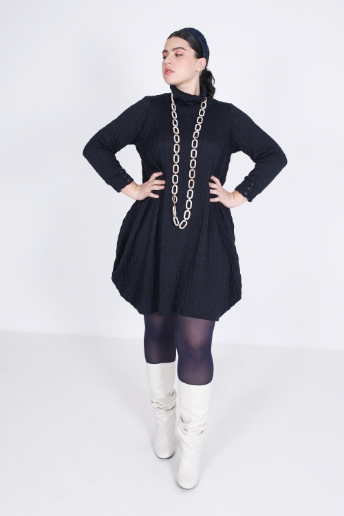 Product details: Plain straight dress. Neckline with collar stand. The top front is formed by a flat fold forming a slit. Bottom of dress in a liquette shape. ¾ sleeve. Sleeve cuffs with wide cuff inlaid with diamond-shaped metal studs. Look suggestion: Unless specifically indicated, accessories are not included with this product.