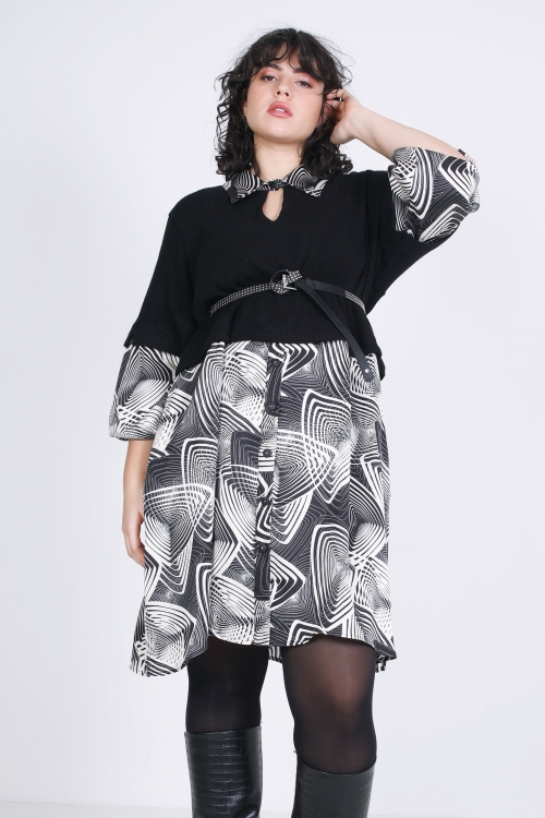 Main material: soft and stretchy lurex mesh White poplin shirt yoke Removable structured stand-up collar Long sleeves with buttoned cuffs Side pockets Length above the knee Made in France. Chic style and absolute comfort This black lurex knit dress by Jean-Marc Philippe is captivating thanks to its refined contrast between the softness of the knit and the...