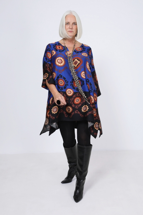 Let yourself be seduced by the sumptuous look of this long viscose satin tunic, a signature piece by Jean-Marc Philippe. Its refined baroque print, blending gold, black, and olive green tones, enhances the silhouette with radiance and character. The fluidity of the 100% natural viscose satin caresses the skin and adds a subtle shine to every movement....