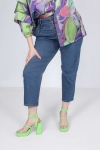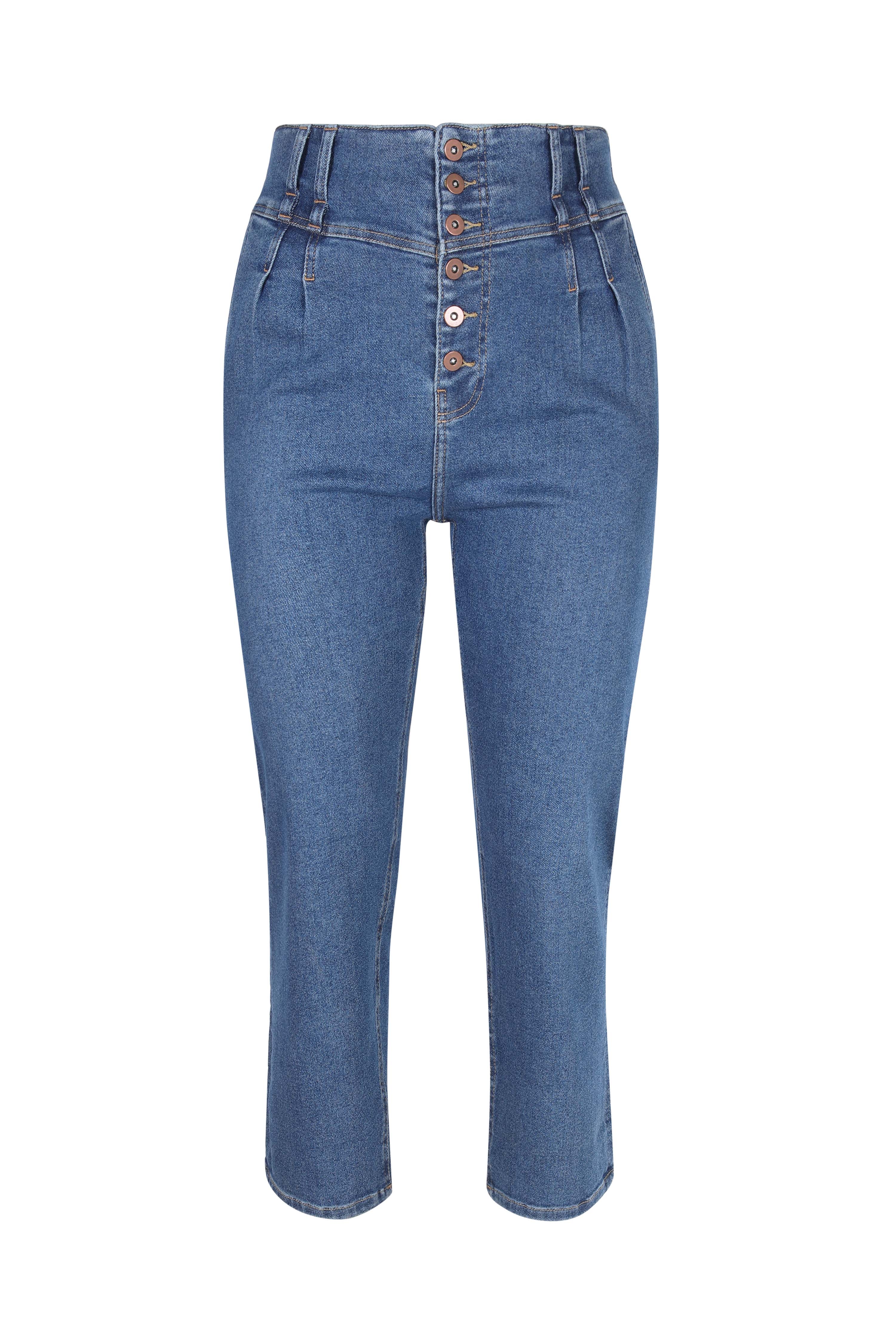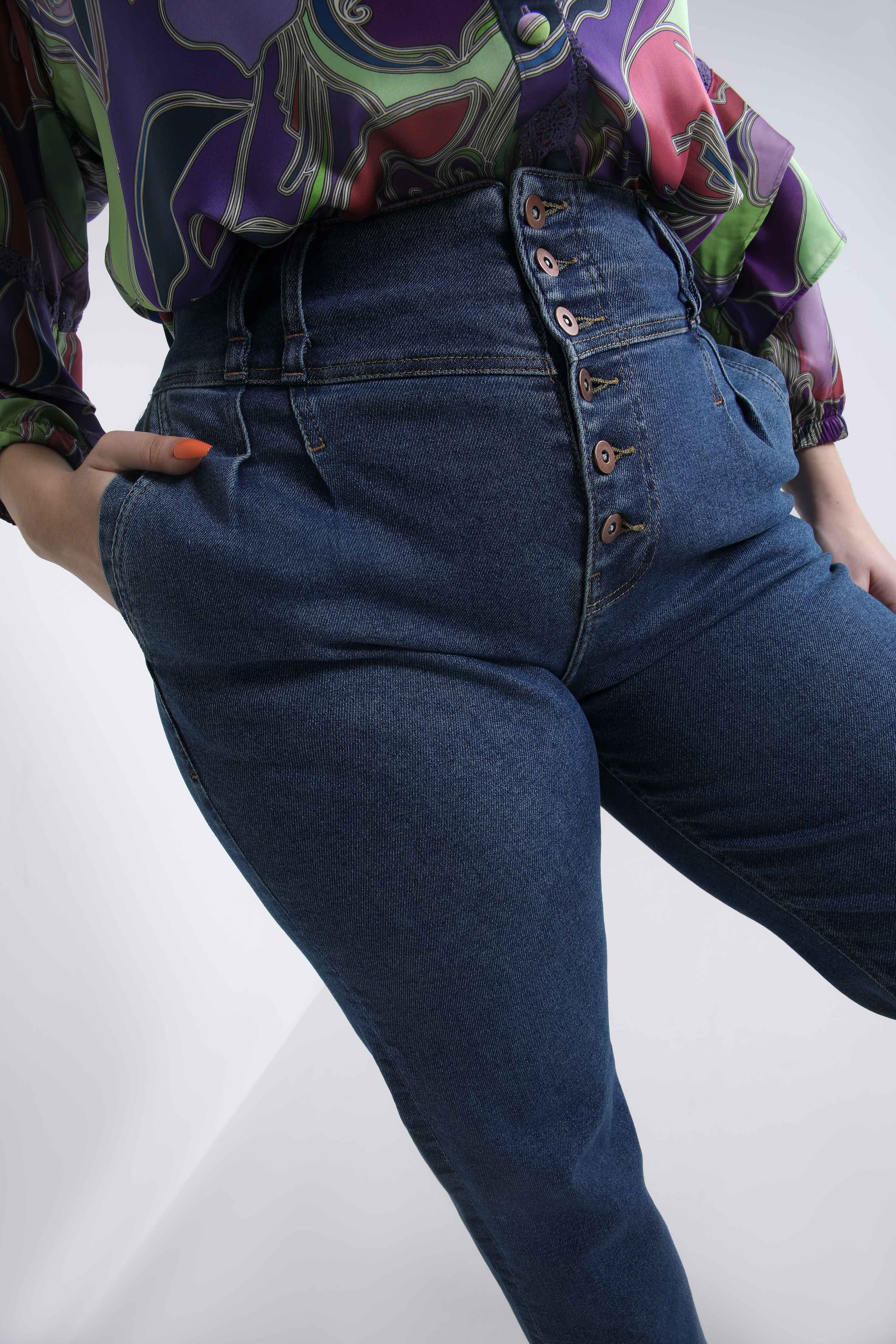• High waist with fly closing with visible buttons.