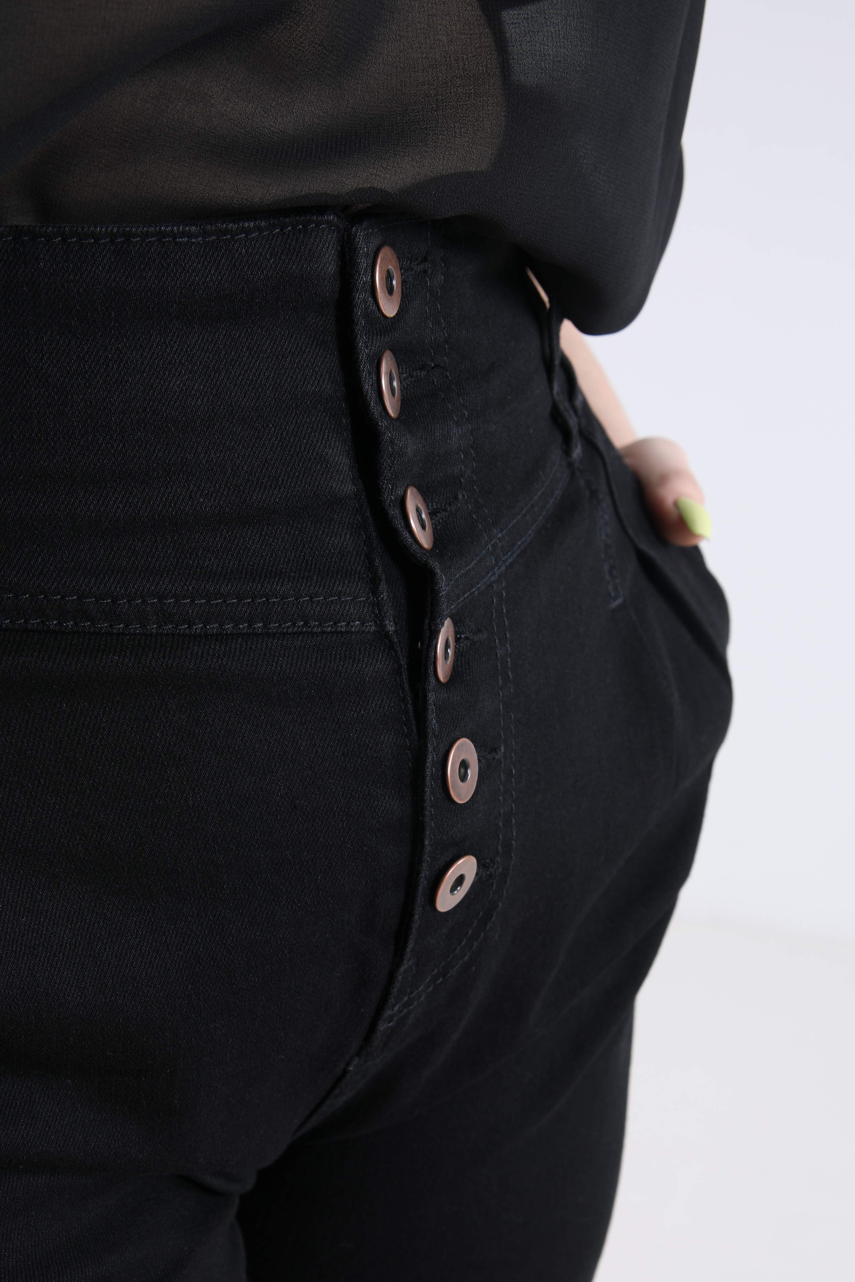 • High waist with fly closing with visible buttons.