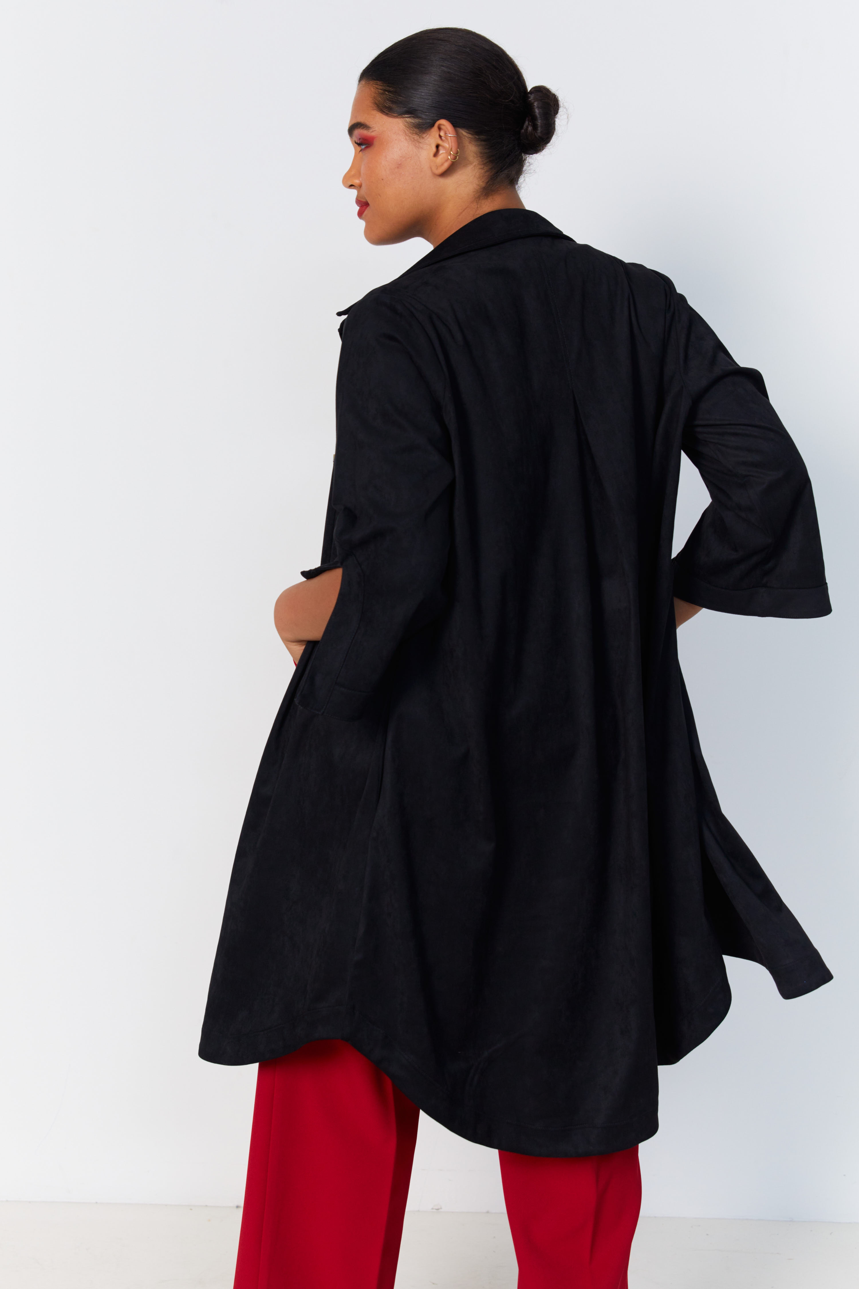 Sublimez votre allure avec cette chemise longue en scuba suédine, douce et légèrement extensible.