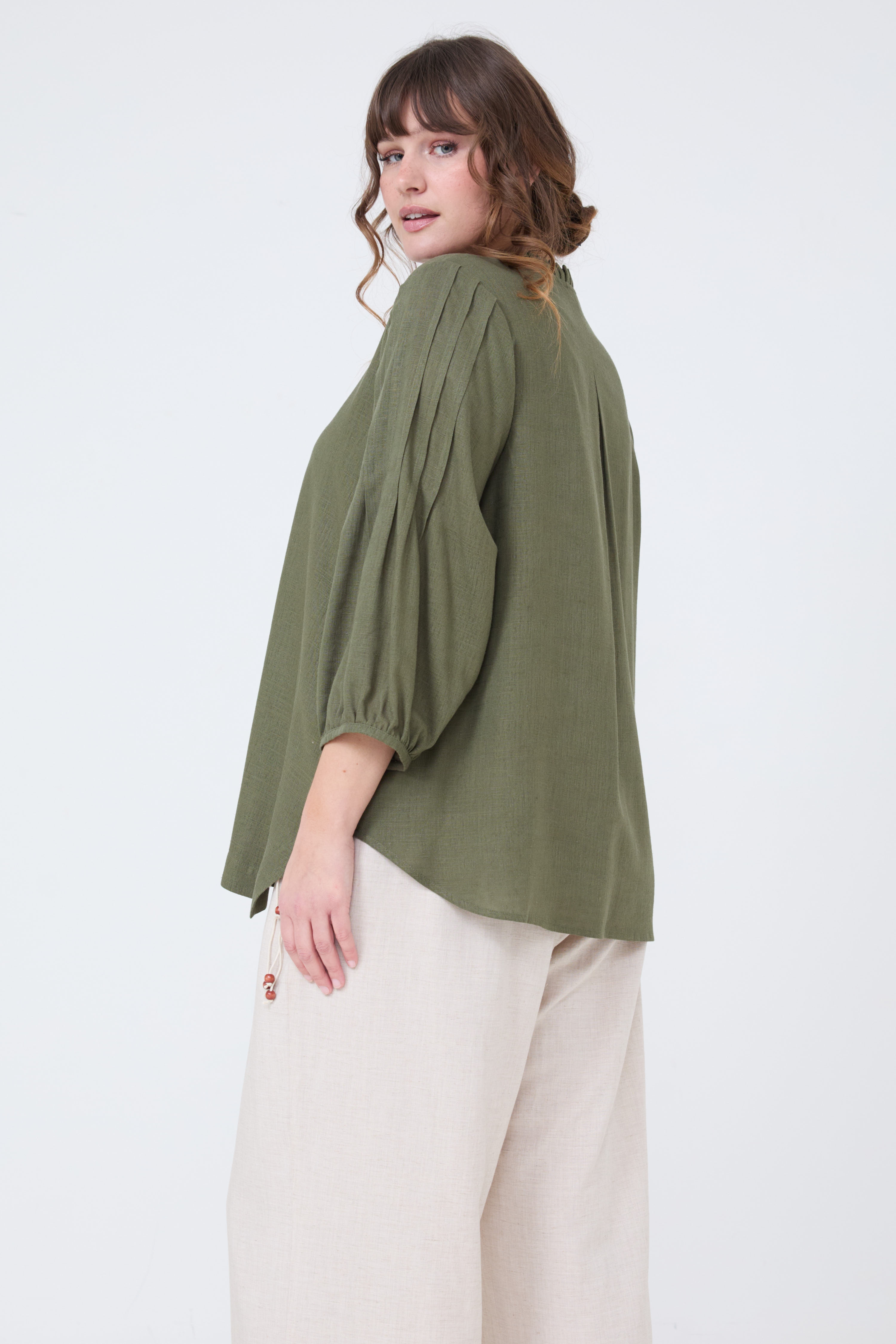 • Manche ¾ avec une rangée de plis plats sur le haut.