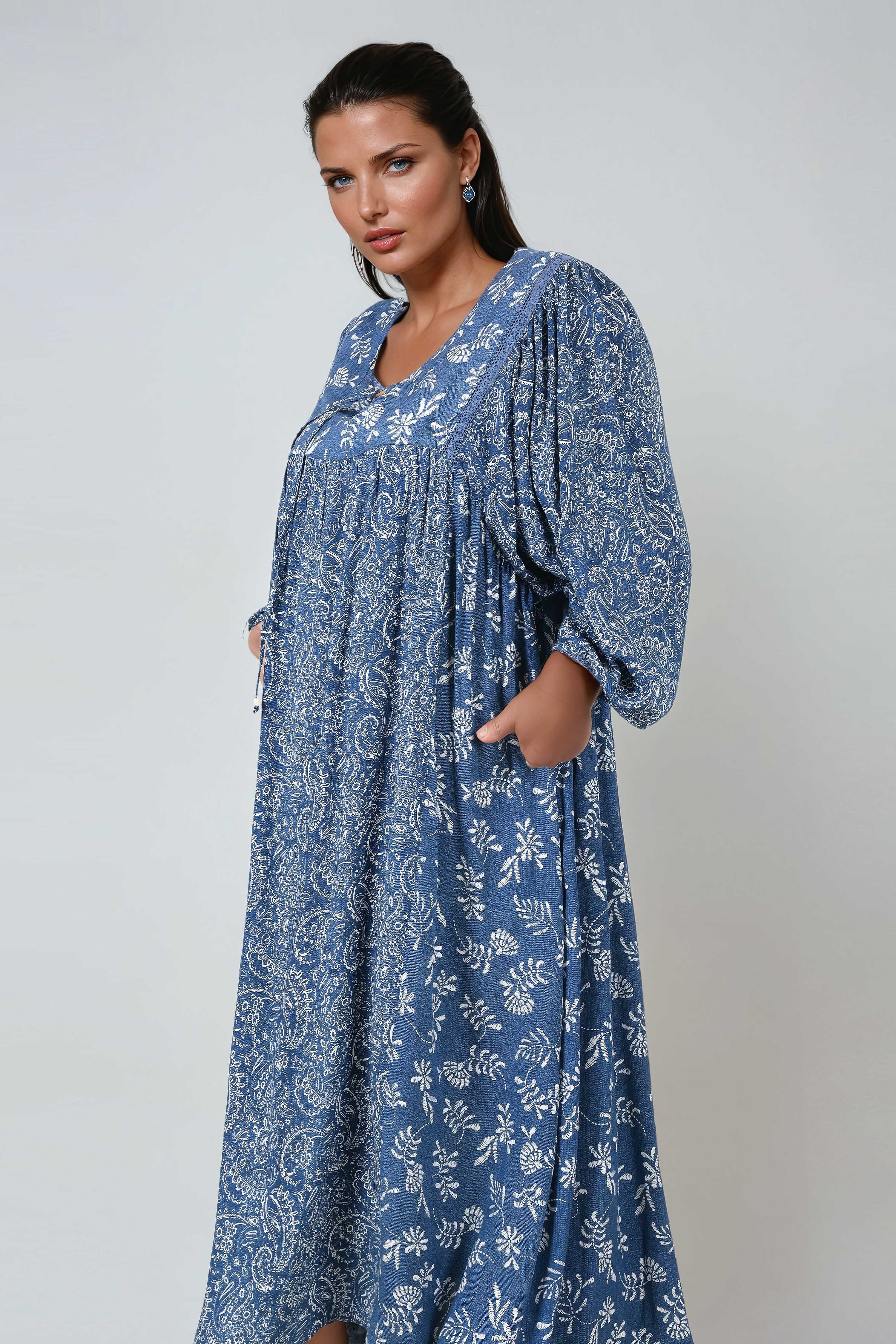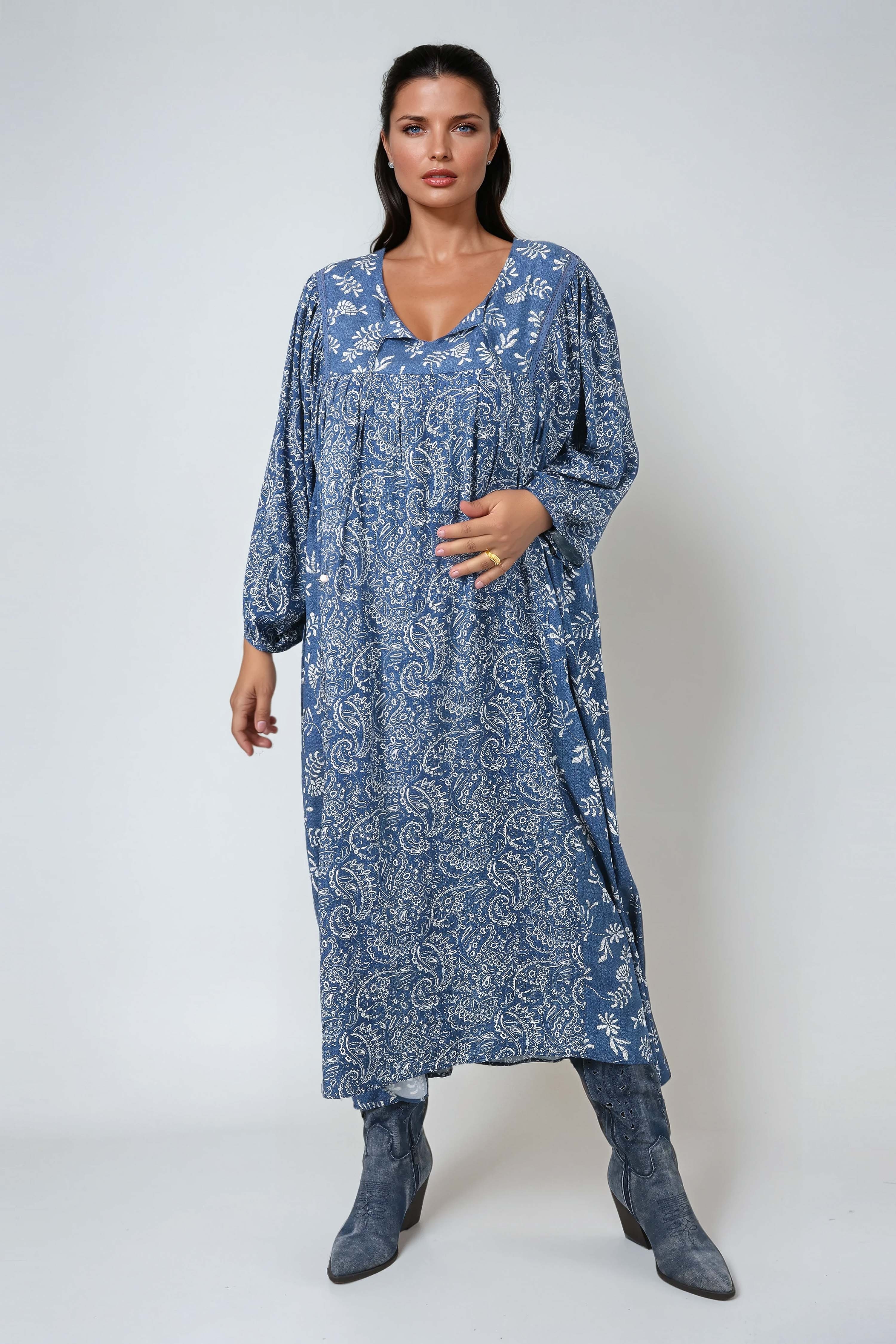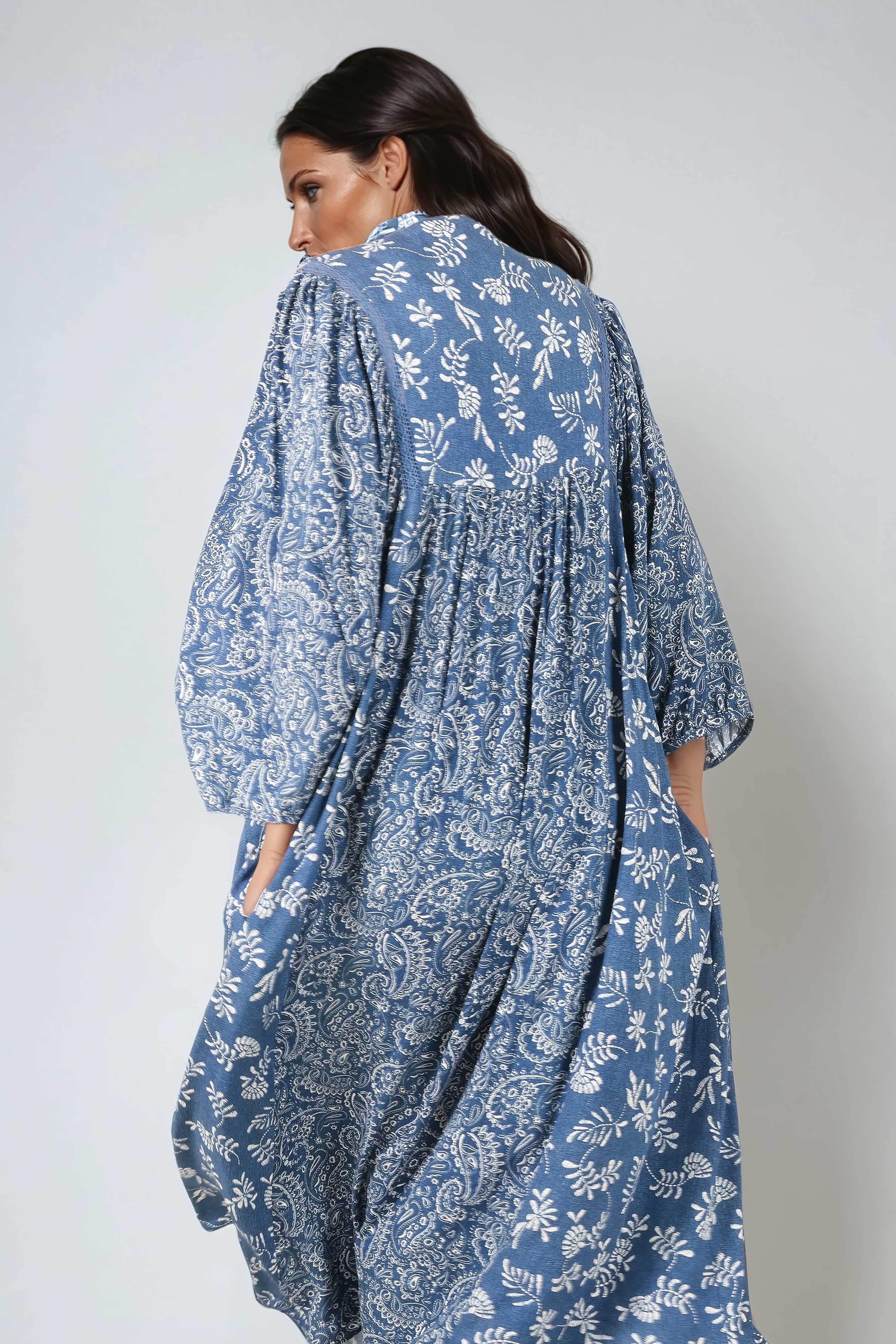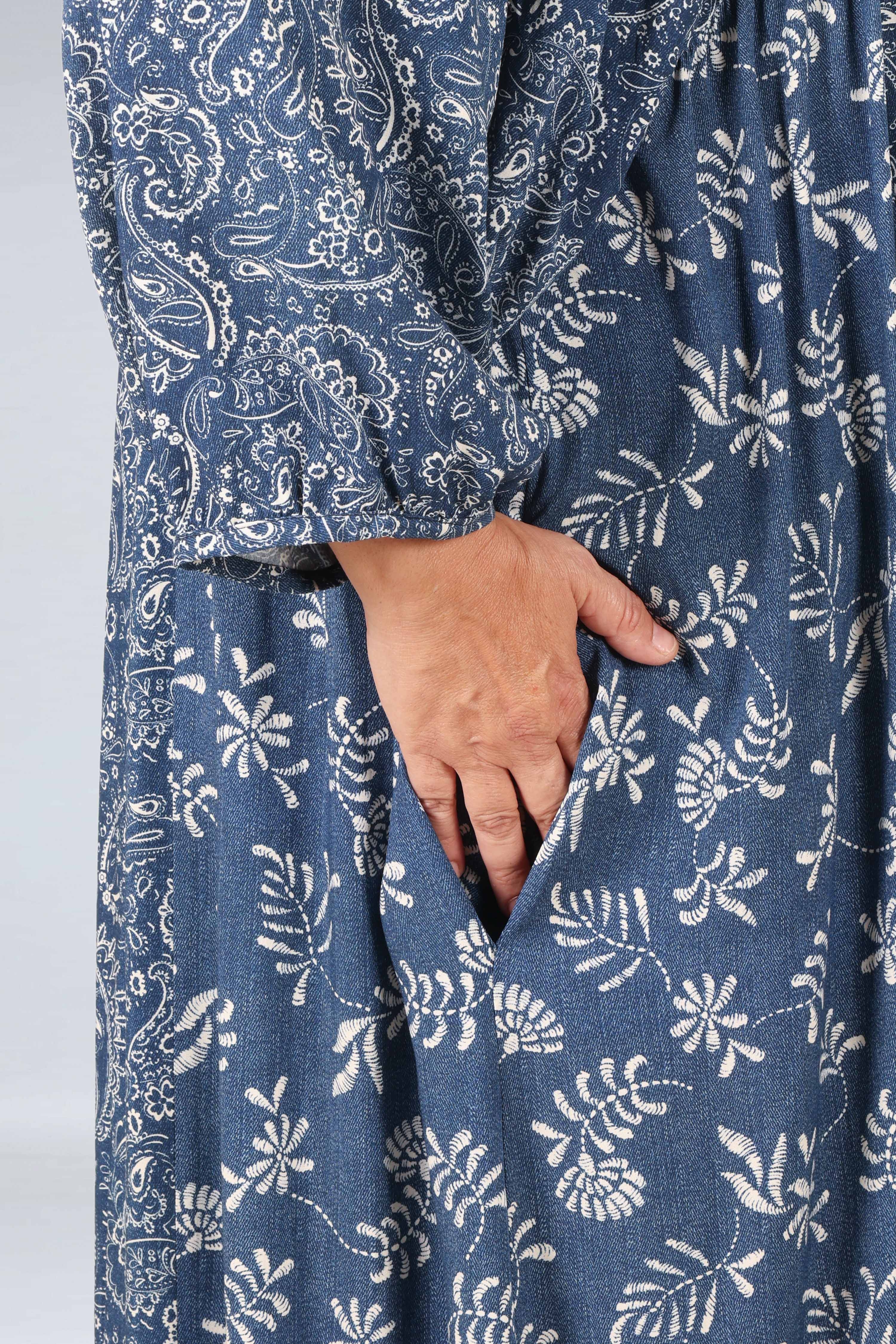 • Robe longue avec patch indigo de deux motifs floral et cachemire.
