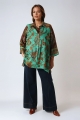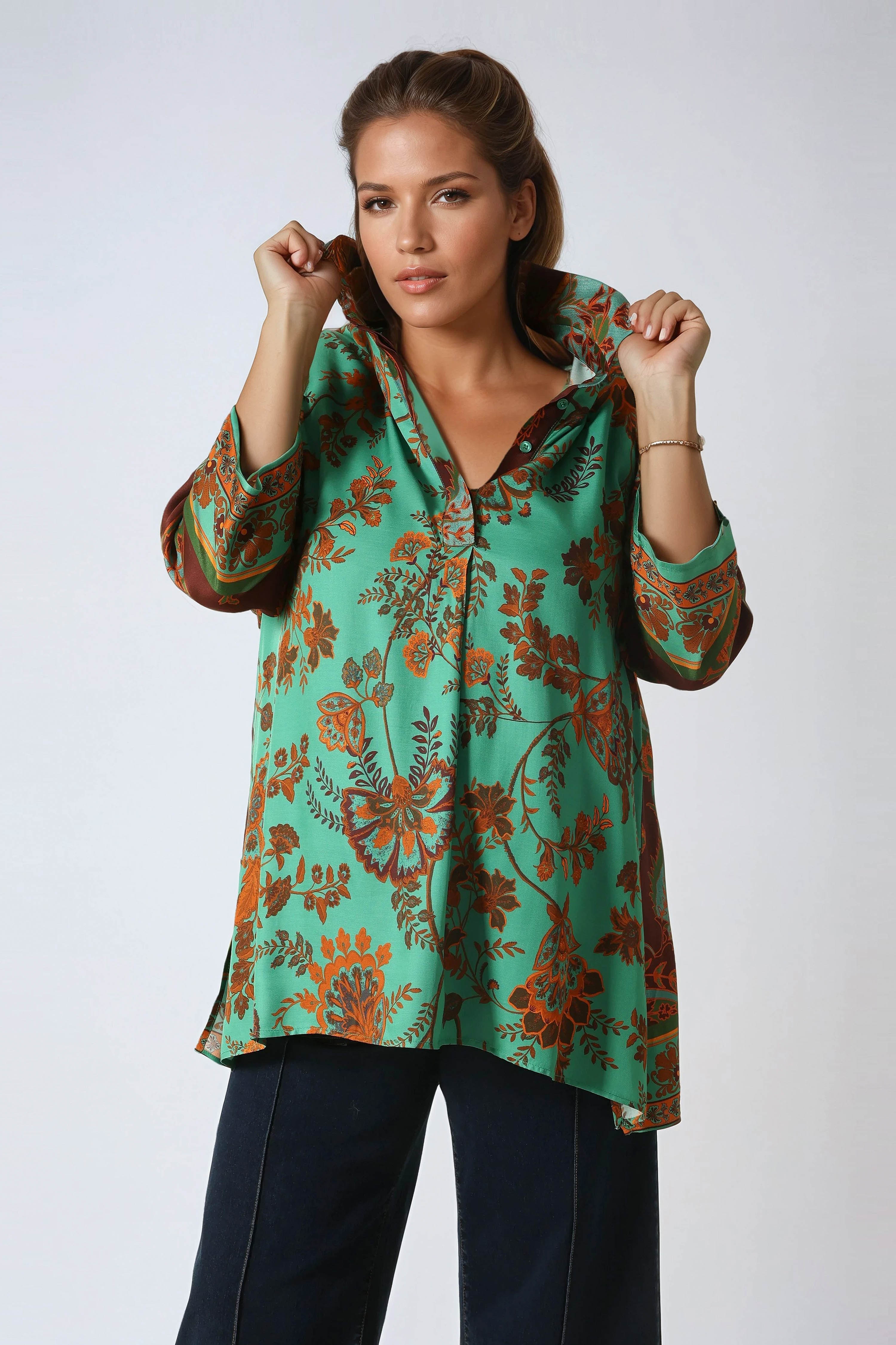 Éclat bohème et élégance fusionnée. Découvrez la tunique Porto Alegre, une pièce lumineuse en viscose légère, confectionnée dans un patchwork audacieux de deux imprimés : un vert émeraude vibrant et un brun terre de Sienne intense. Son col chemise structuré contraste avec la fluidité de sa coupe ample, idéale pour un look à la fois chic et décontracté. Les manches 3/4 légèrement évasées et la finition droite accentuent son allure libre et moderne, tandis que le mélange de motifs floraux et cachemire lui donne une touche ethnique raffinée.