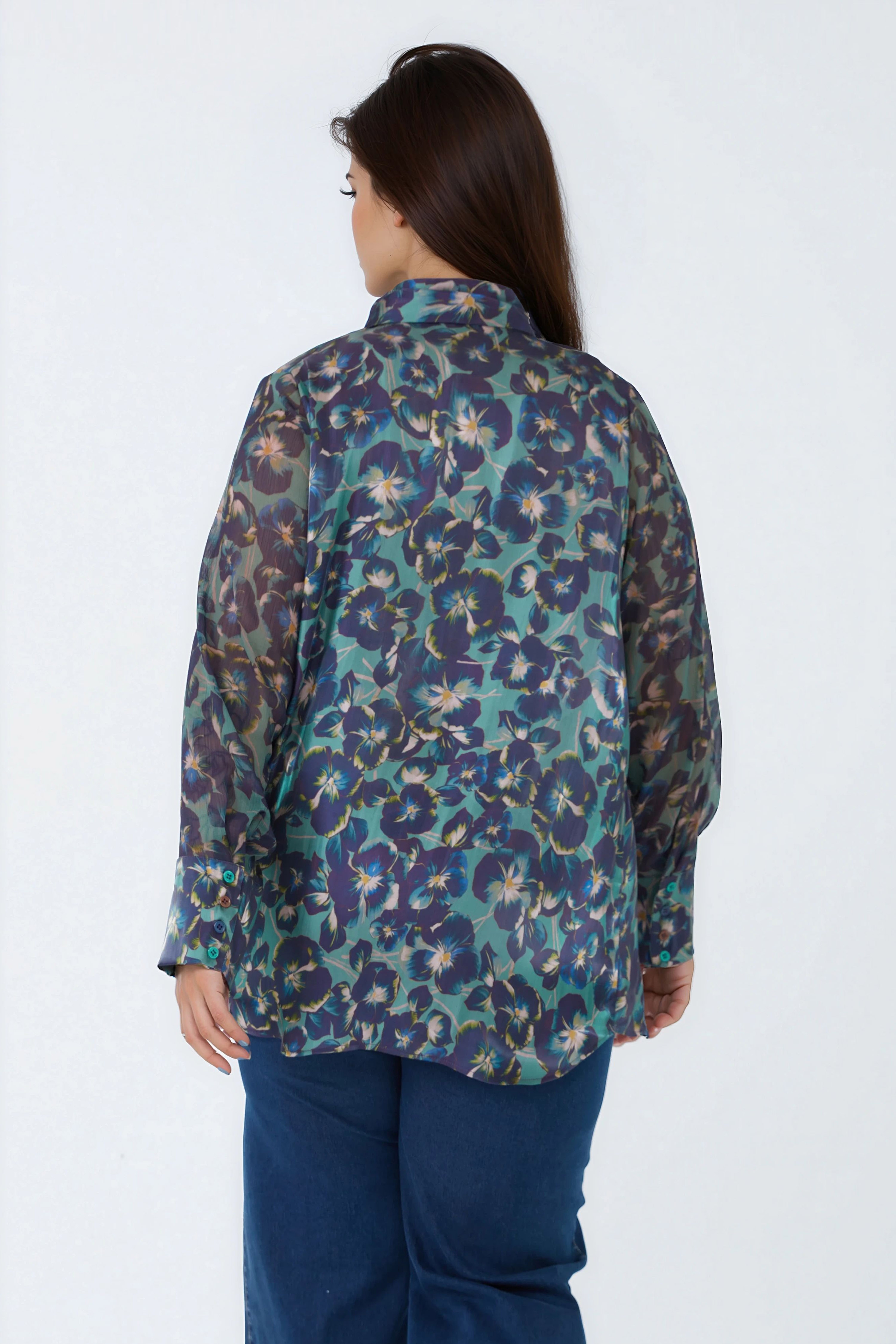 Son motif floral aux nuances de bleu, vert et prune illumine la silhouette, tandis que les manches longues en voile transparent apportent une note subtile de légèreté et de féminité.