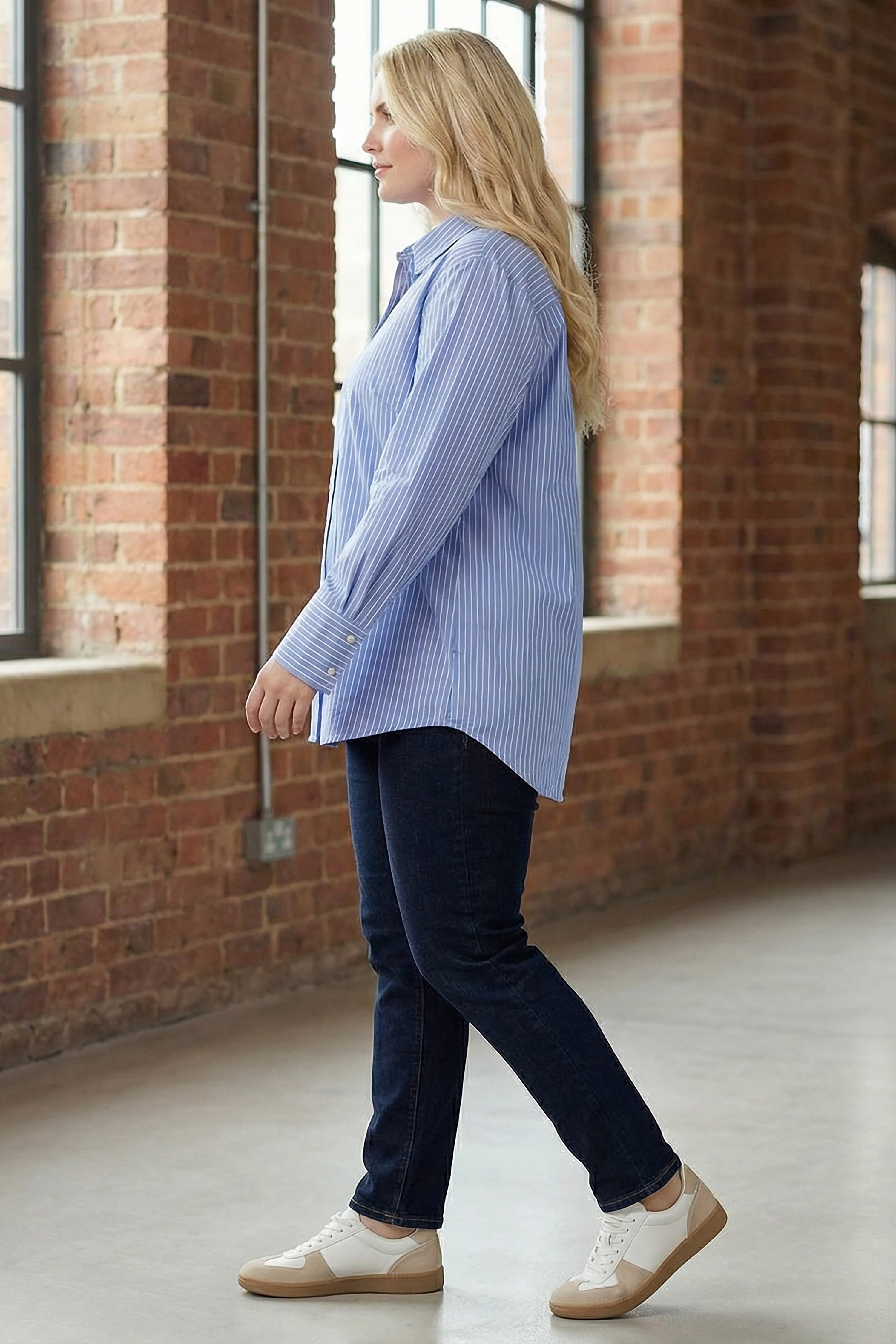 Le col classique, les poignets boutonnés et la base arrondie assurent un style soigné, idéal aussi bien pour un look casual que pour une tenue plus habillée.