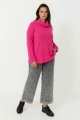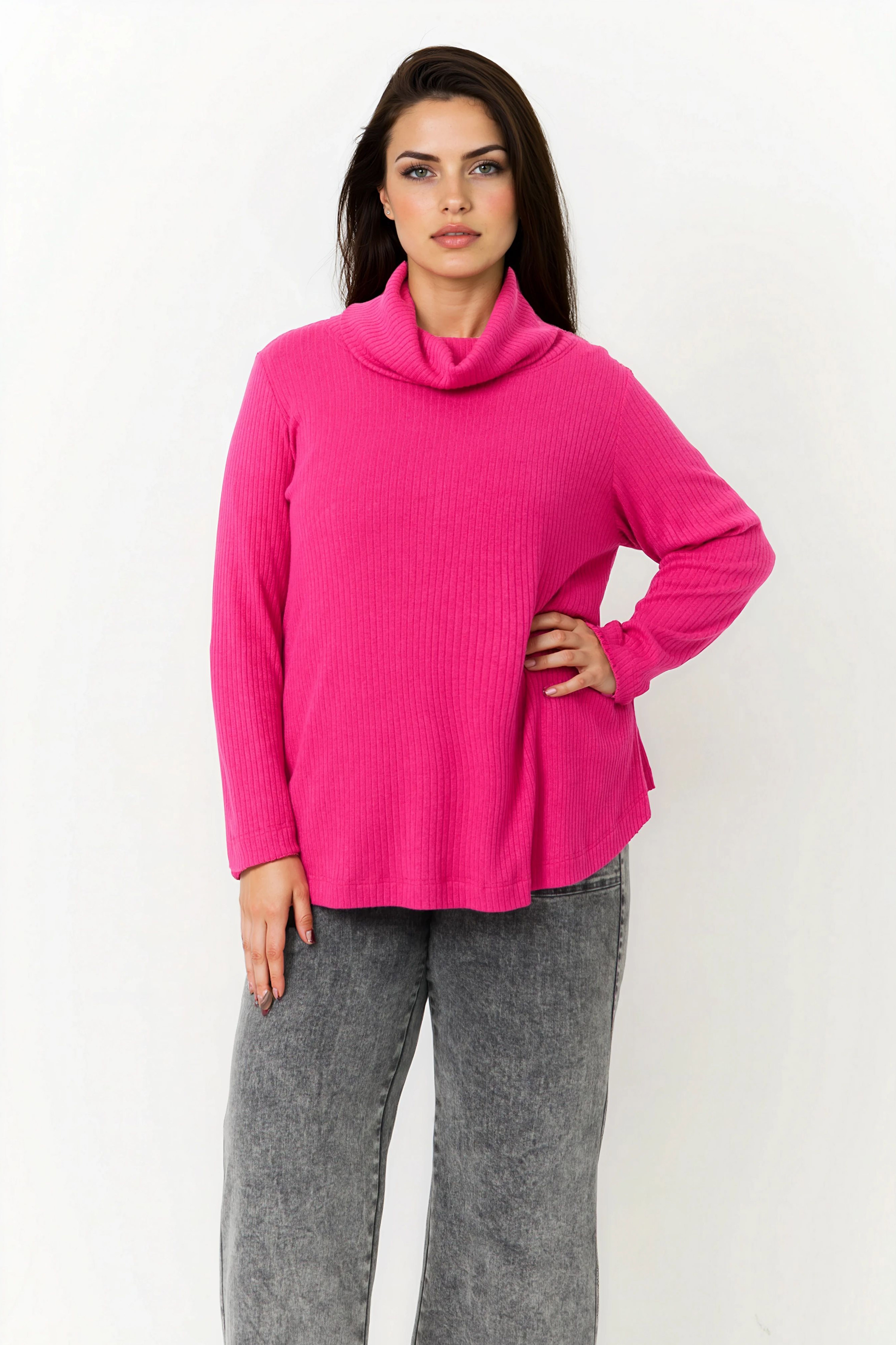 Son col bénitier élégant apporte une belle structure autour du visage, tandis que sa coupe légèrement évasée assure une silhouette harmonieuse et flatteuse, idéale pour les morphologies grande taille. La maille côtelée verticale affine visuellement et apporte un joli relief au modèle.