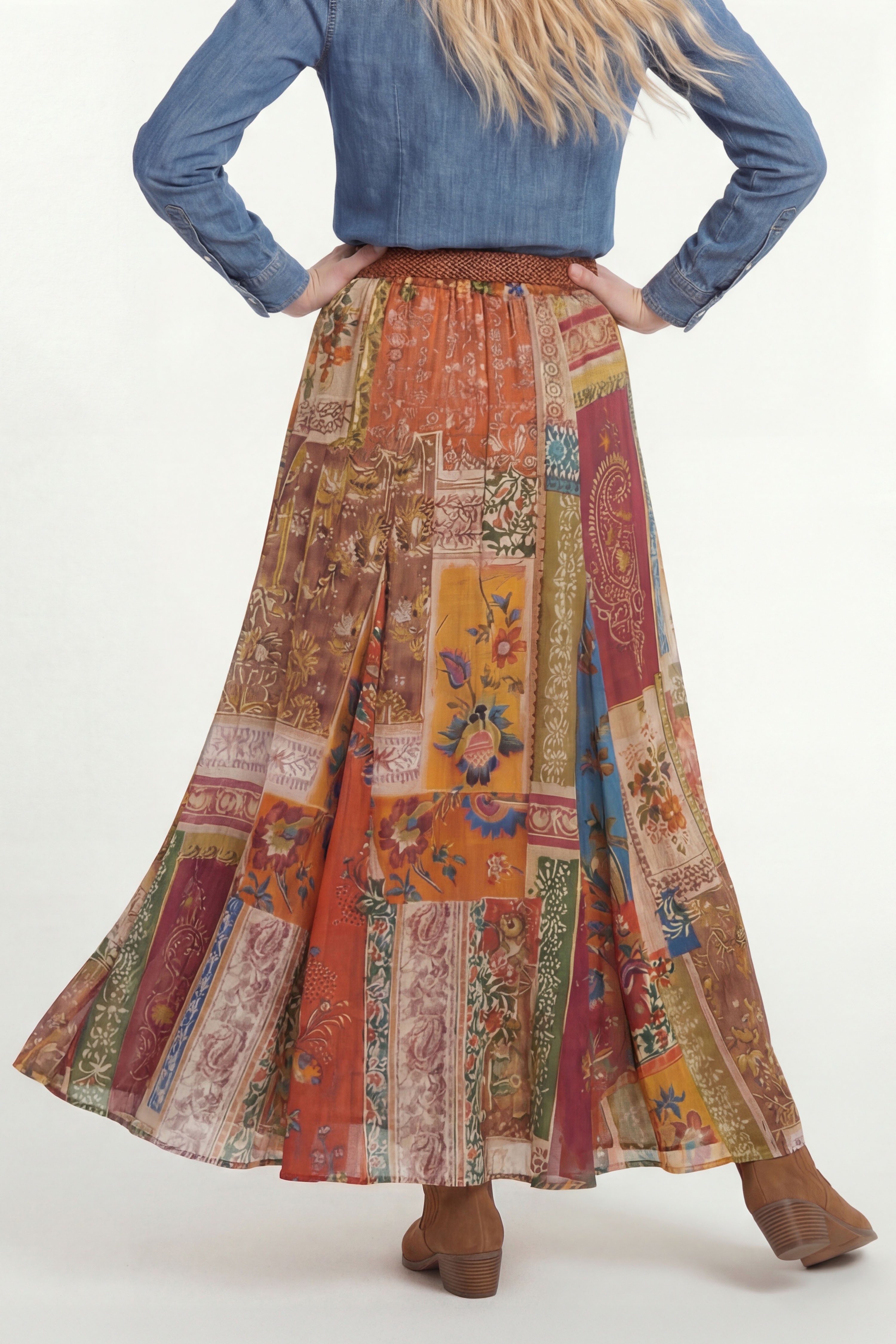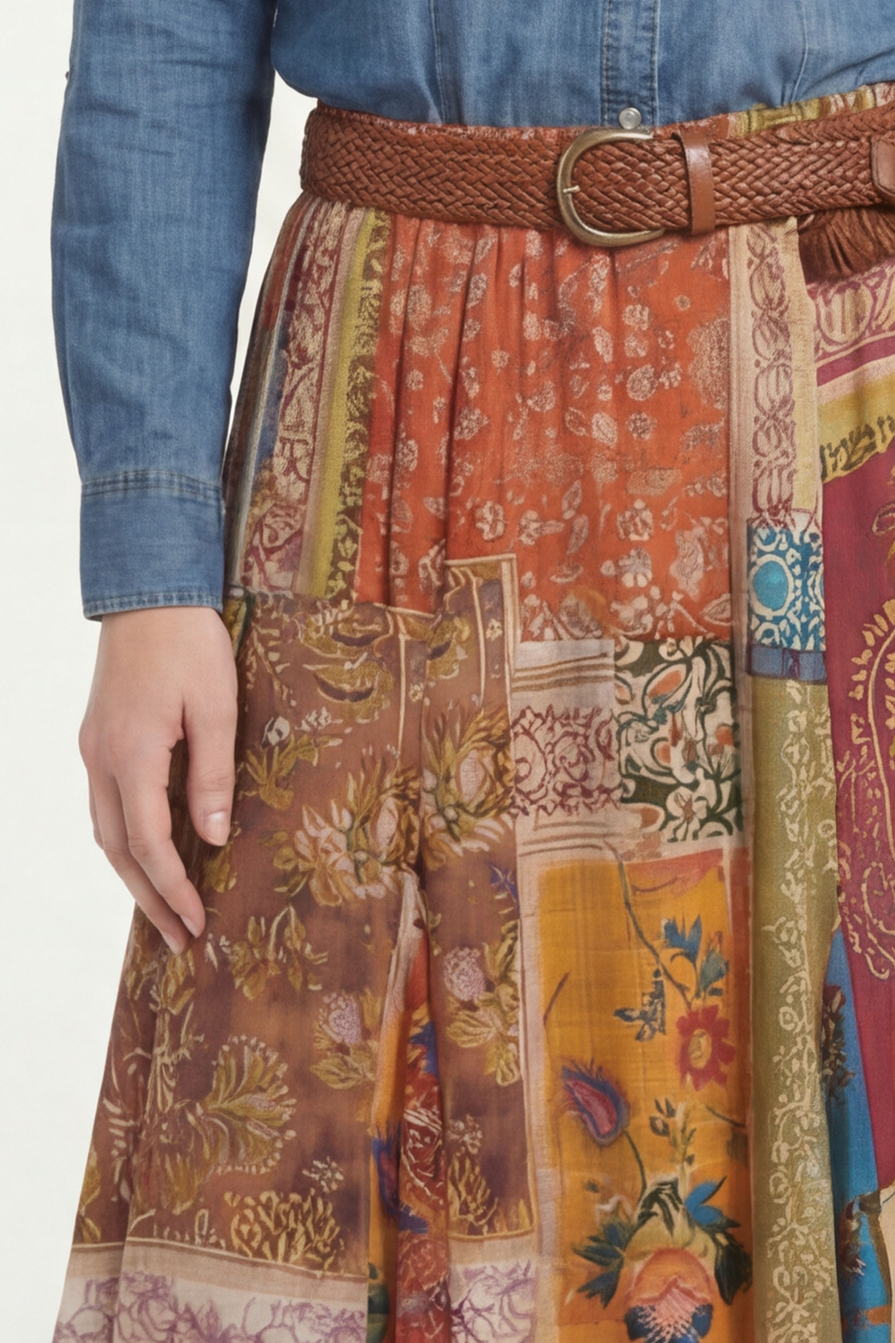 Son jeu de motifs patchwork aux teintes chaleureuses apporte du caractère à la silhouette tout en restant facile à associer.