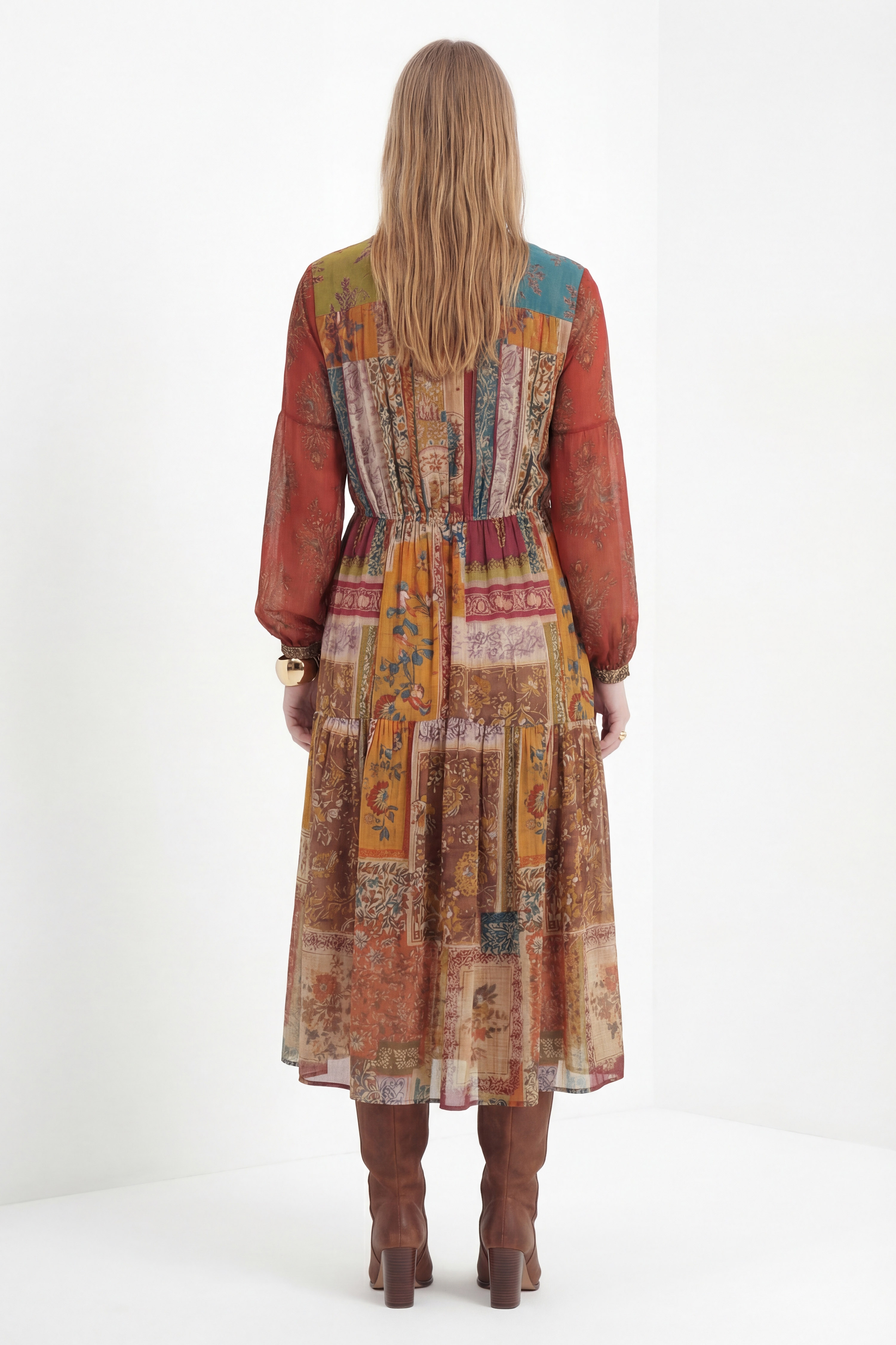Cette robe longue séduit par son jeu de patchwork aux imprimés raffinés, mêlant couleurs chaudes et motifs d’inspiration bohème.