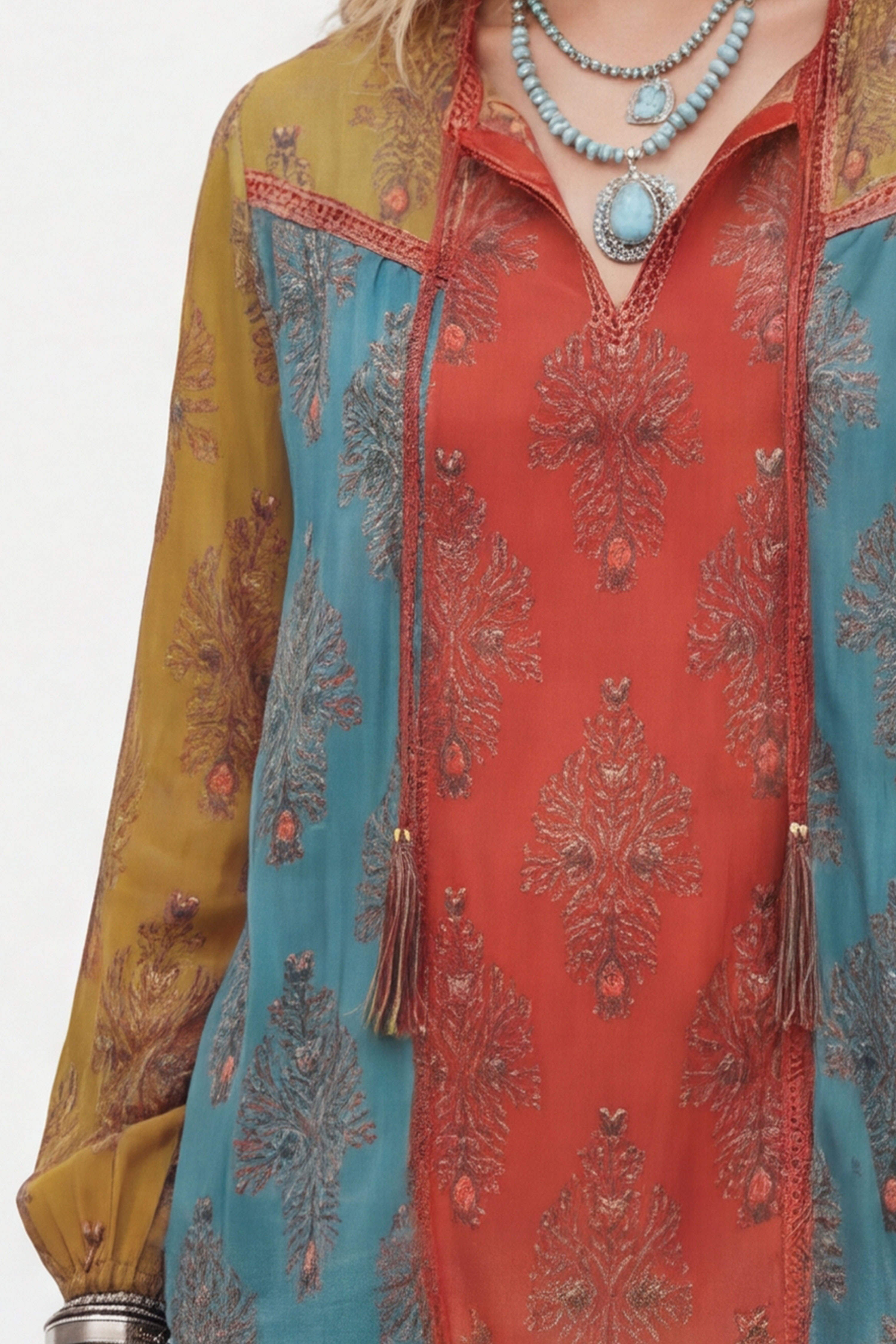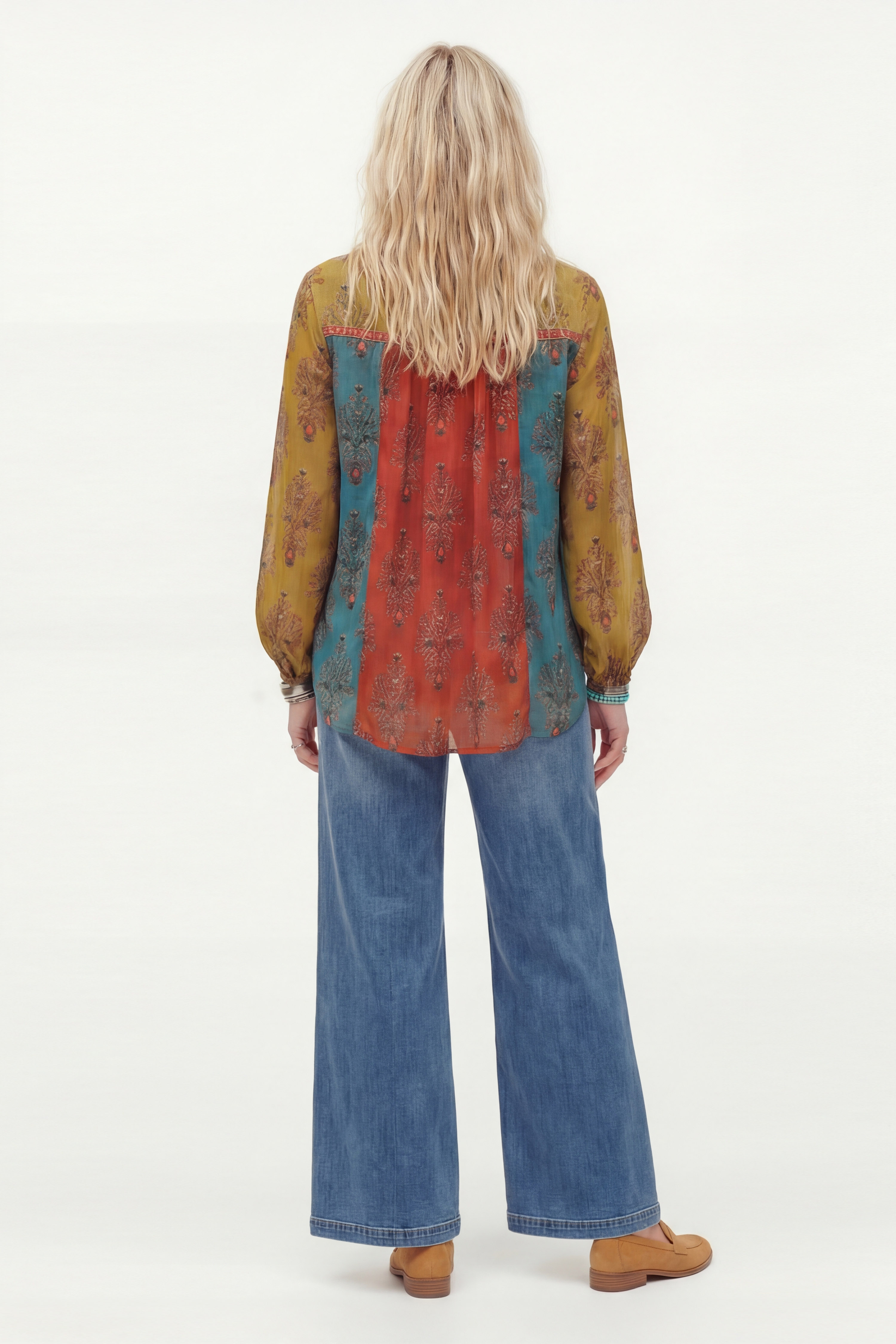 Légère et pleine de caractère, cette chemise en voile séduit par son jeu de plusieurs imprimés aux inspirations bohèmes.