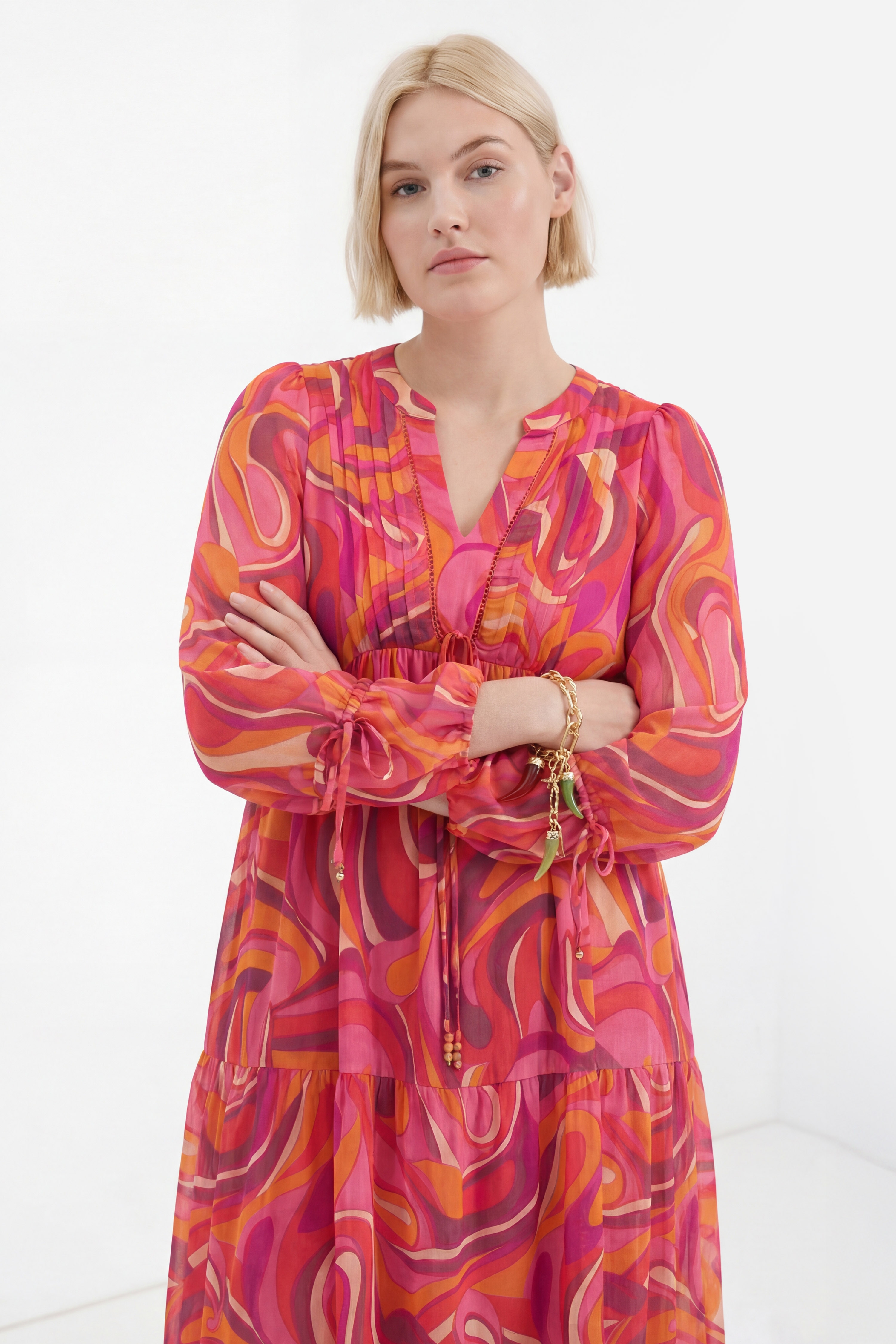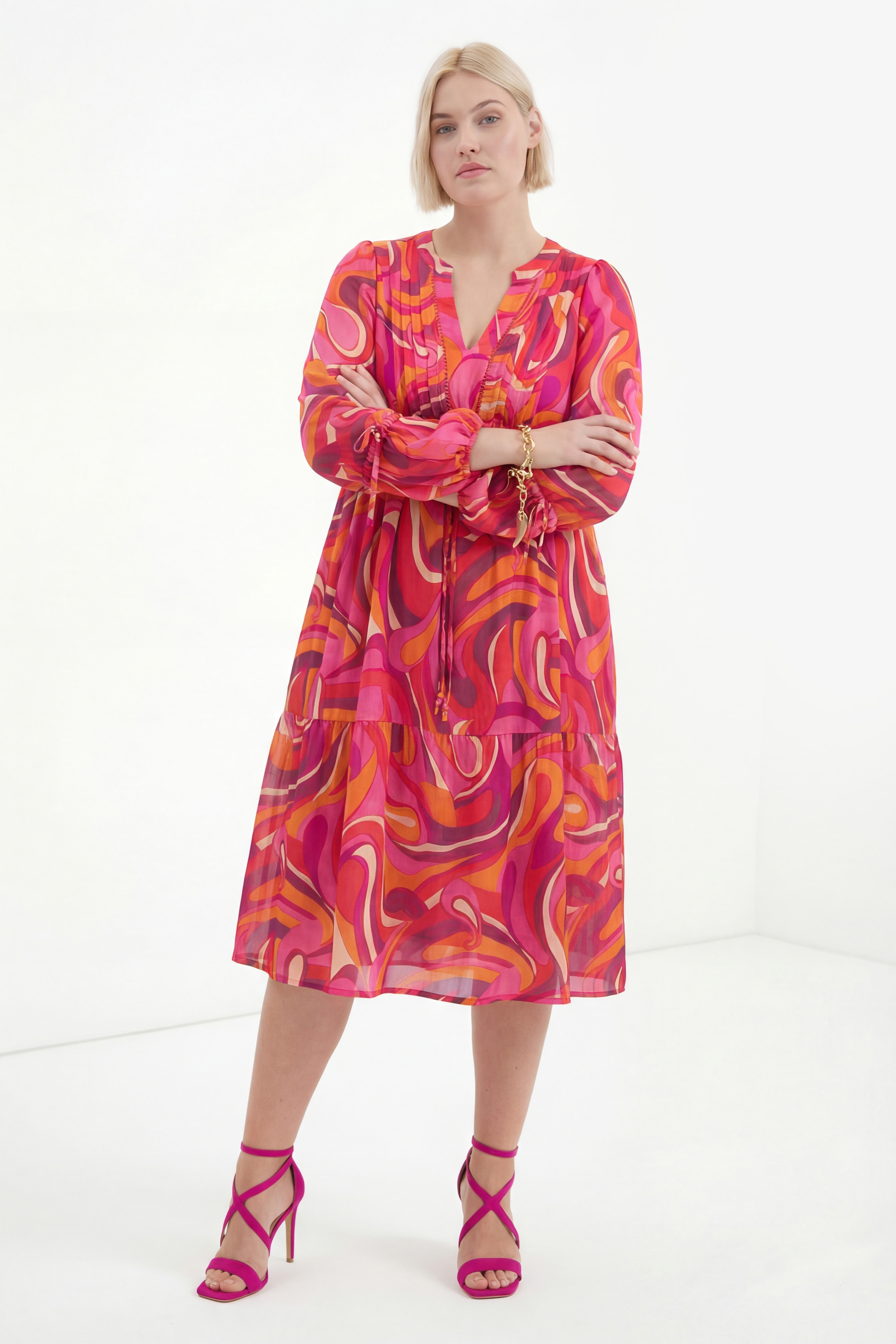 Son imprimé vibrant aux nuances de rose, fuchsia et orange illumine la silhouette tandis que la matière satinée apporte une touche chic et légère.Sa coupe ample et féminine, soulignée par un plastron délicat et des manches longues légèrement bouffantes, assure une grande aisance tout en sublimant les formes. Parfaite de jour comme de soirée, elle se porte aussi bien avec des sandales que des talons pour un look sophistiqué et moderne.