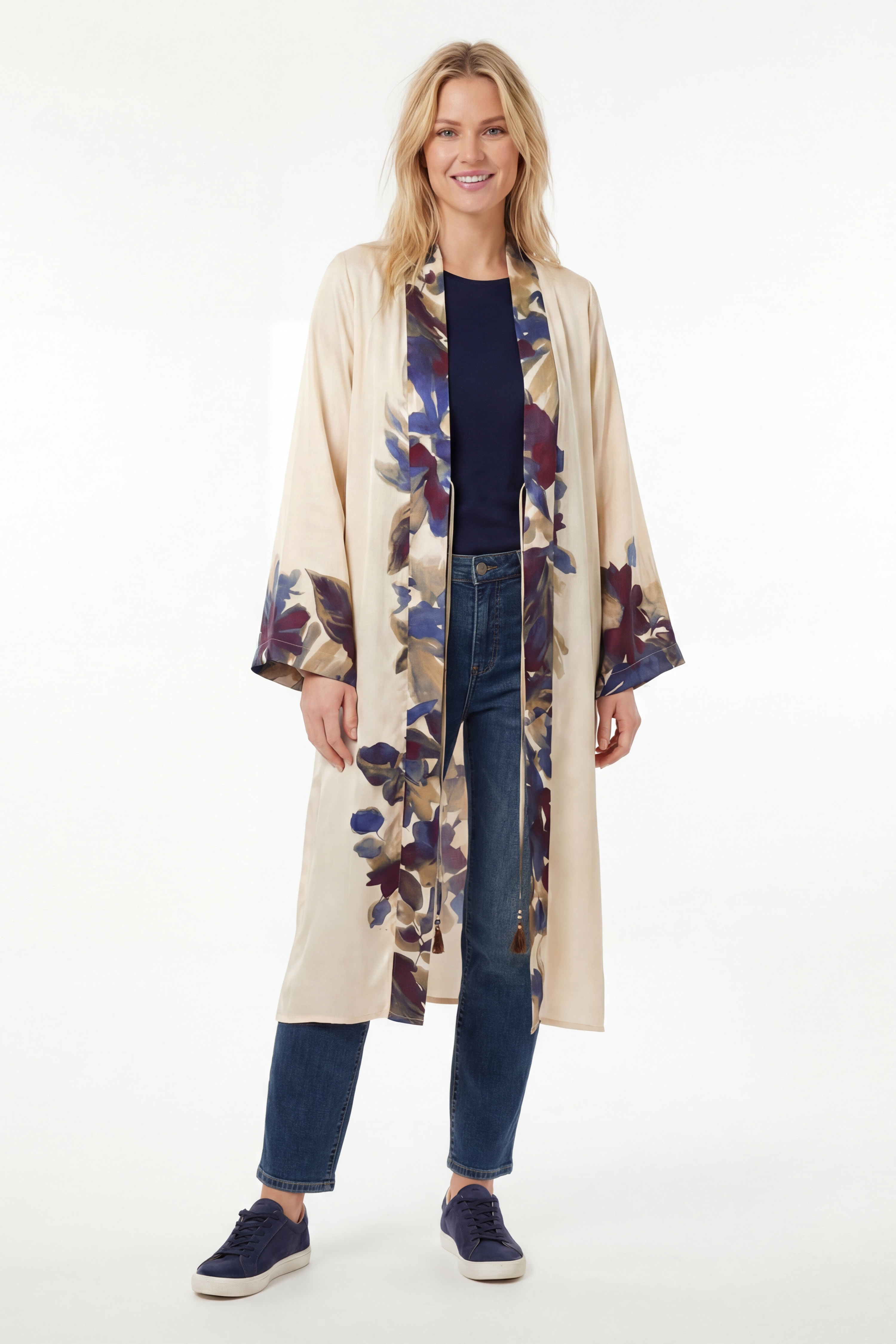 Sa coupe droite et ouverte allonge la ligne et convient à toutes les morphologies. Les manches longues légèrement évasées et les finitions imprimées sur le devant apportent raffinement et modernité.