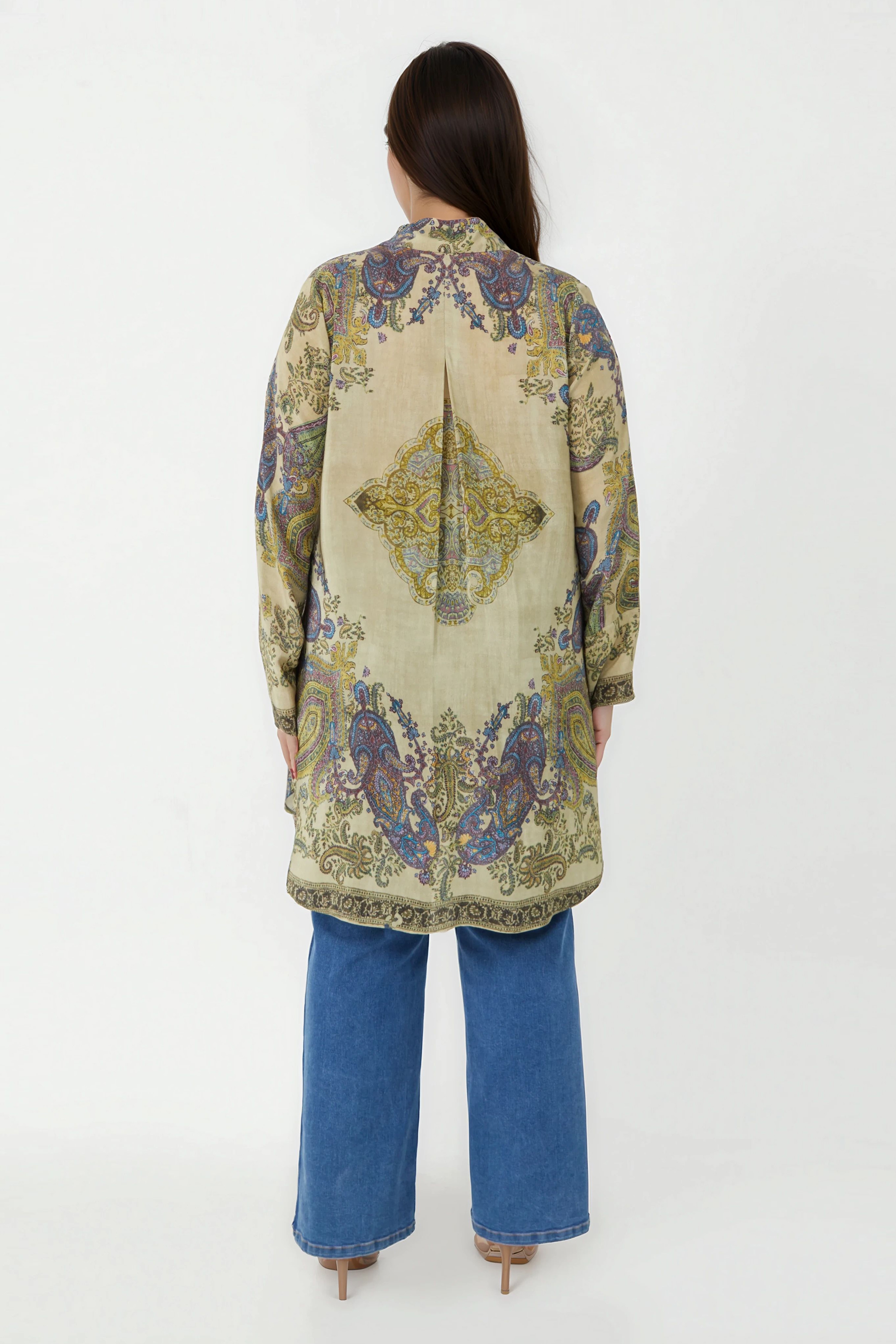 Cette chemise longue séduit par son imprimé d’inspiration cachemire, décliné dans des tons naturels et élégants.
