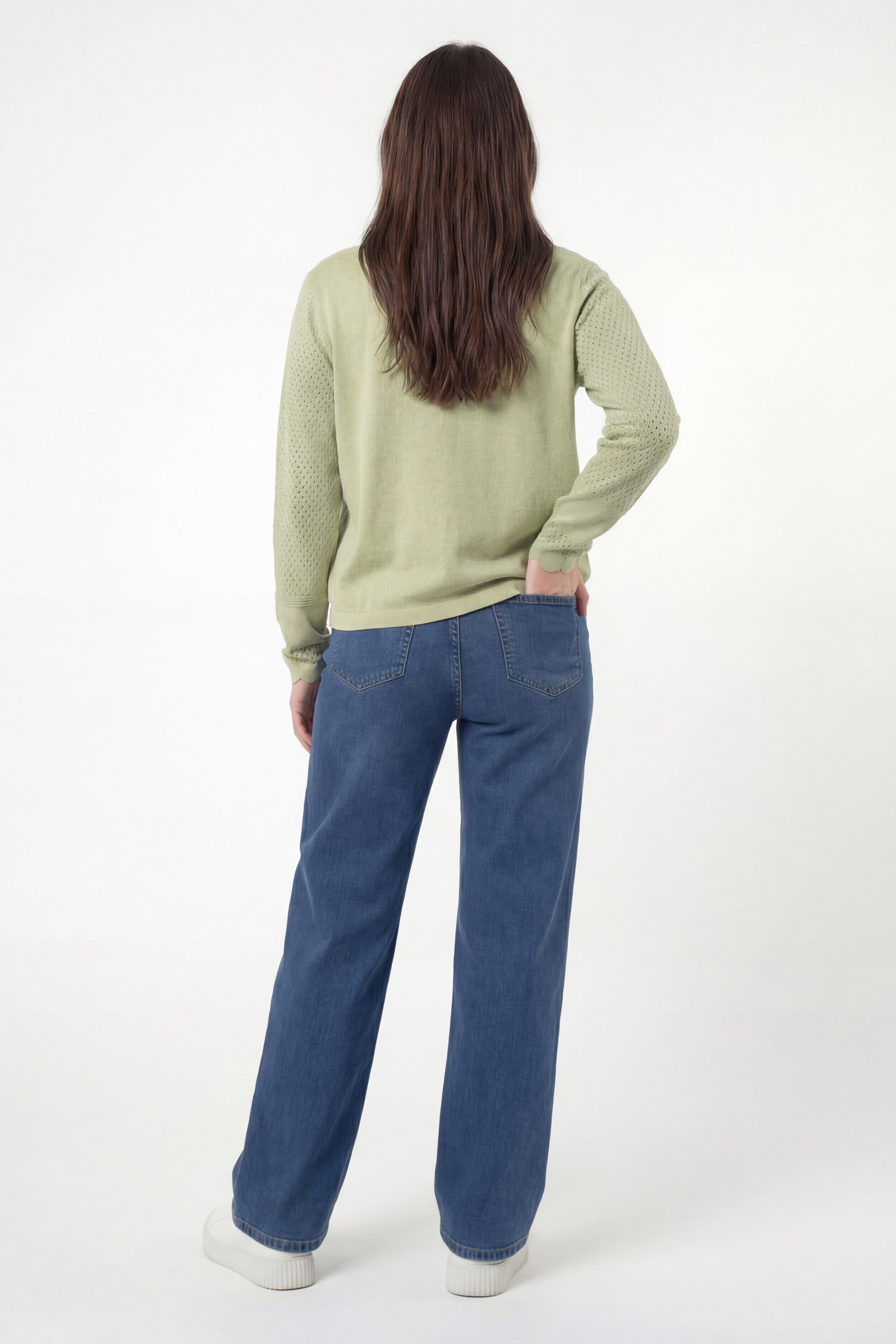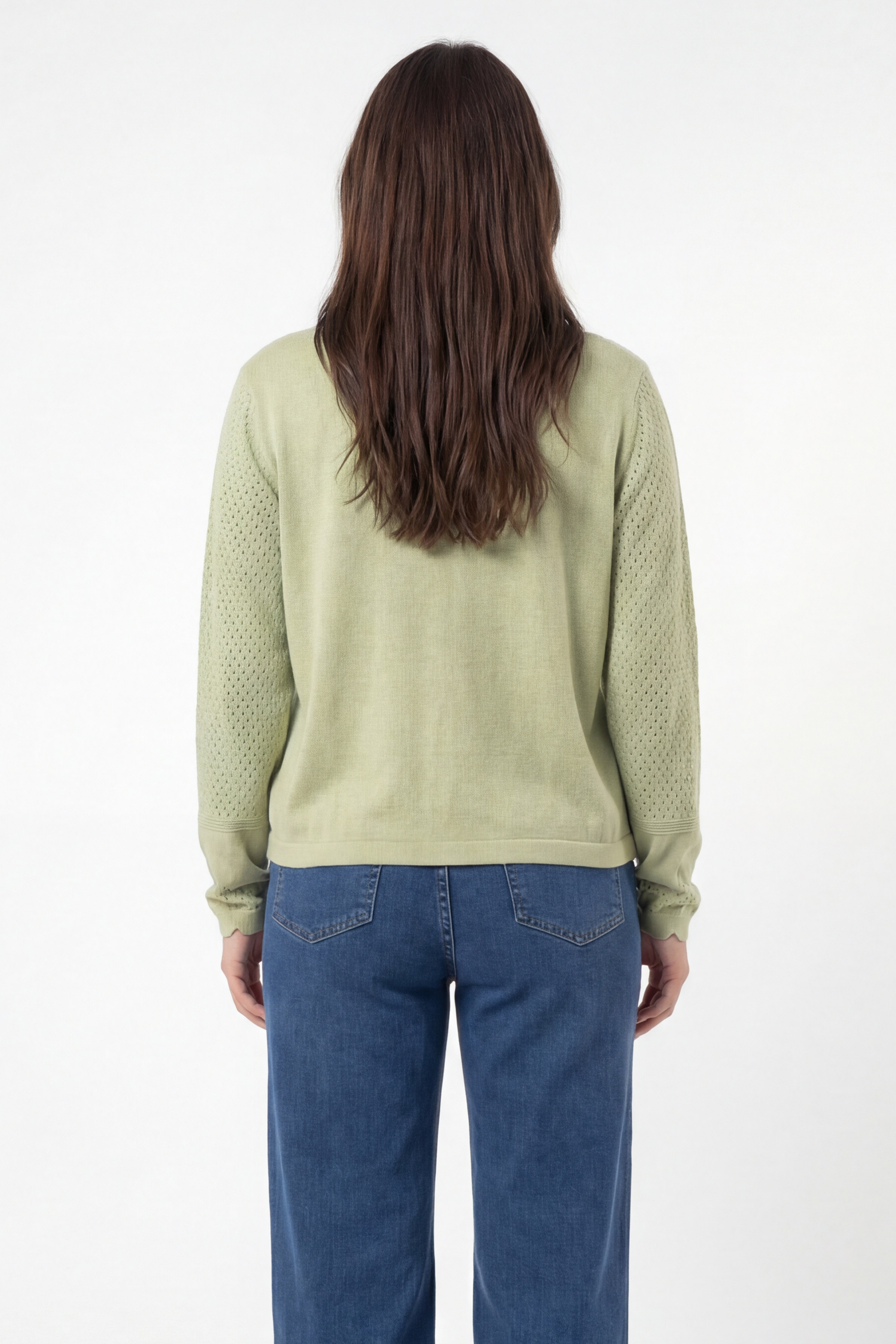 • Sa maille délicatement ajourée apporte de la légèreté et laisse respirer la silhouette, tandis que sa coupe droite fluide s’adapte harmonieusement aux morphologies du 44 au 52.