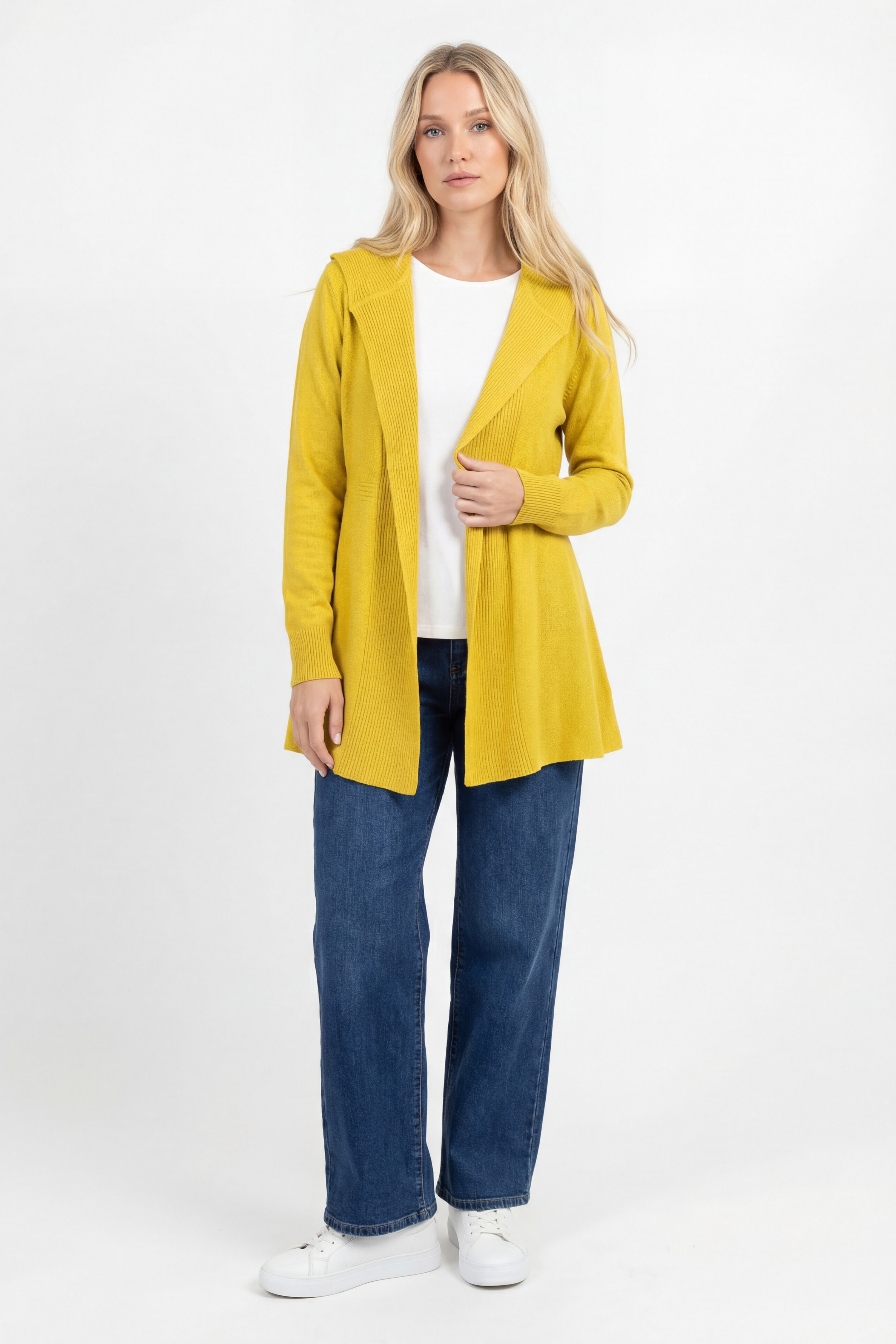 • Sa coupe évasée et sa maille texturée structurent la silhouette tout en apportant une belle fluidité. La capuche intégrée ajoute une touche casual chic, tandis que l’ouverture sur le devant permet de le porter facilement sur un top ou un t-shirt.