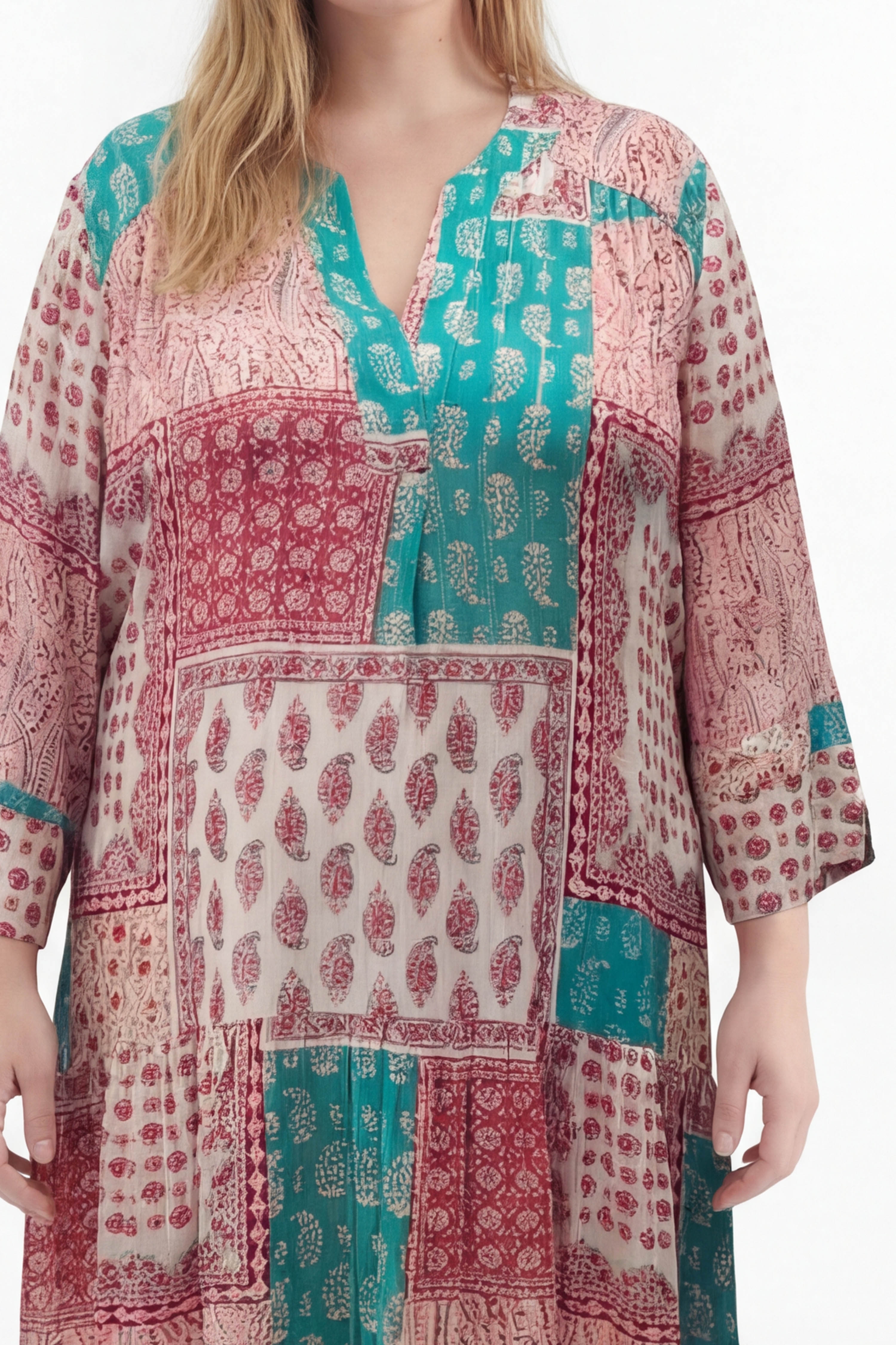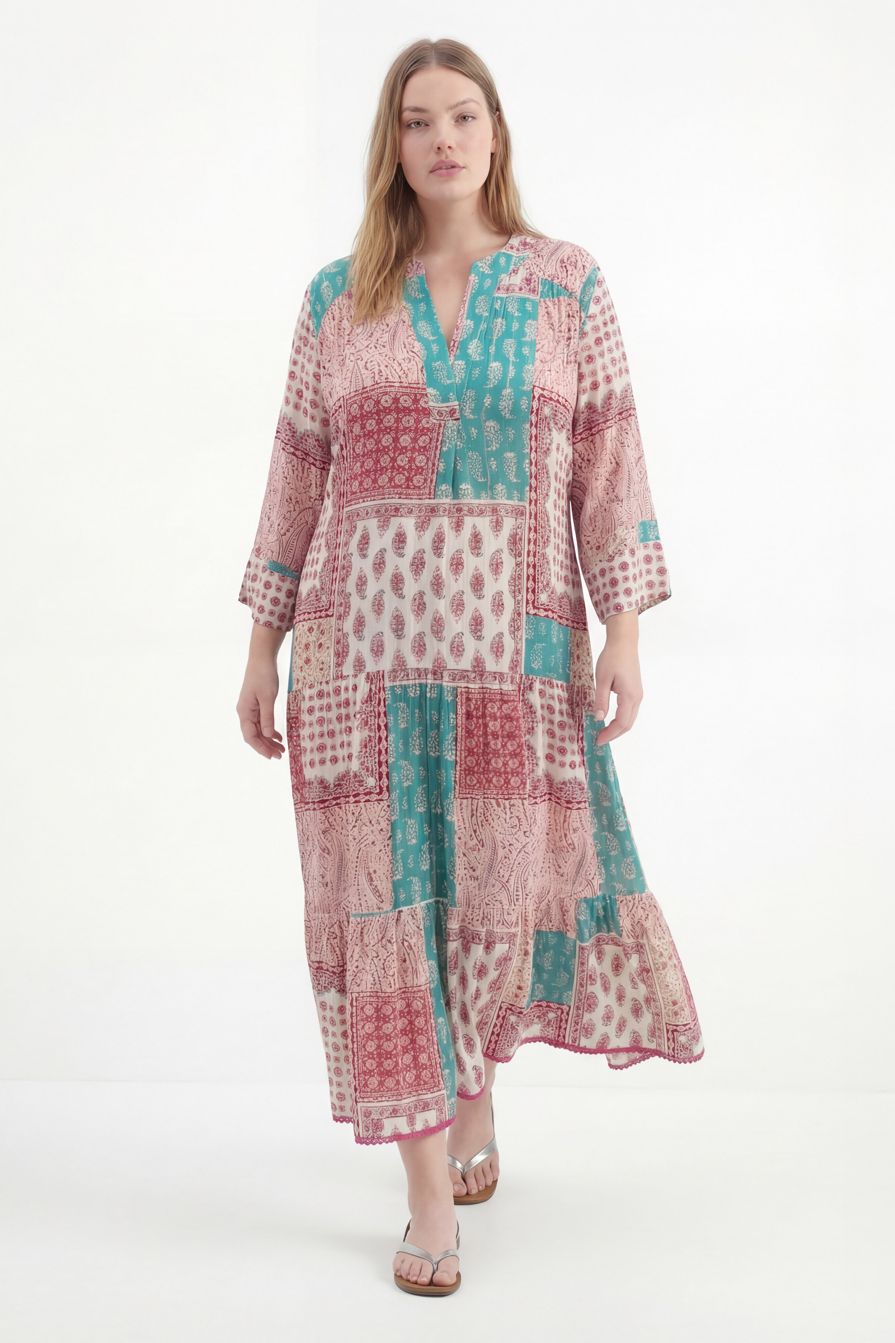Adoptez une allure bohème élégante avec cette robe longue en viscose lurex, légère et agréable à porter. Son imprimé patchwork aux nuances rosées et vert d’eau apporte fraîcheur et originalité, tandis que les fils lurex subtilement intégrés illuminent la silhouette avec discrétion.