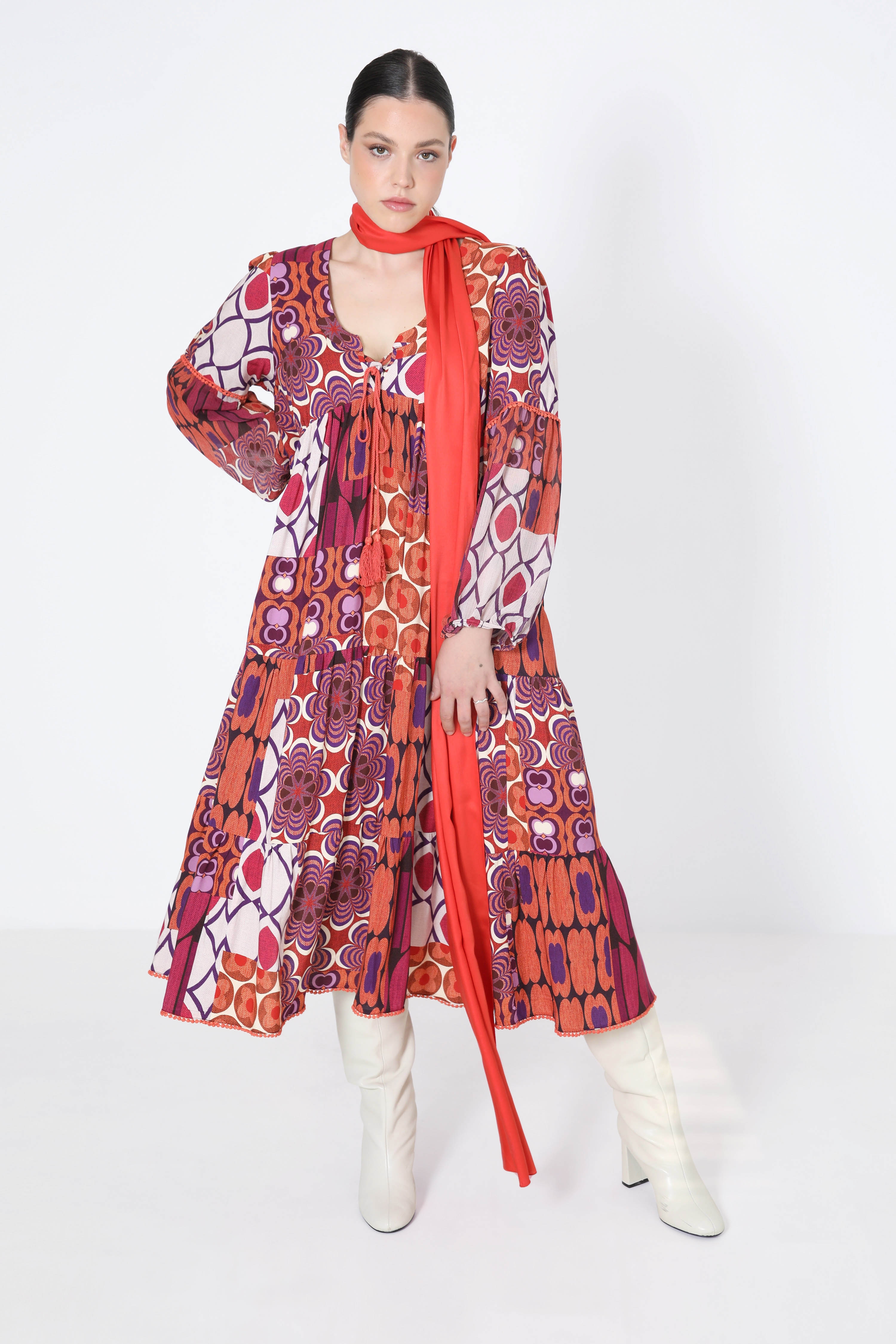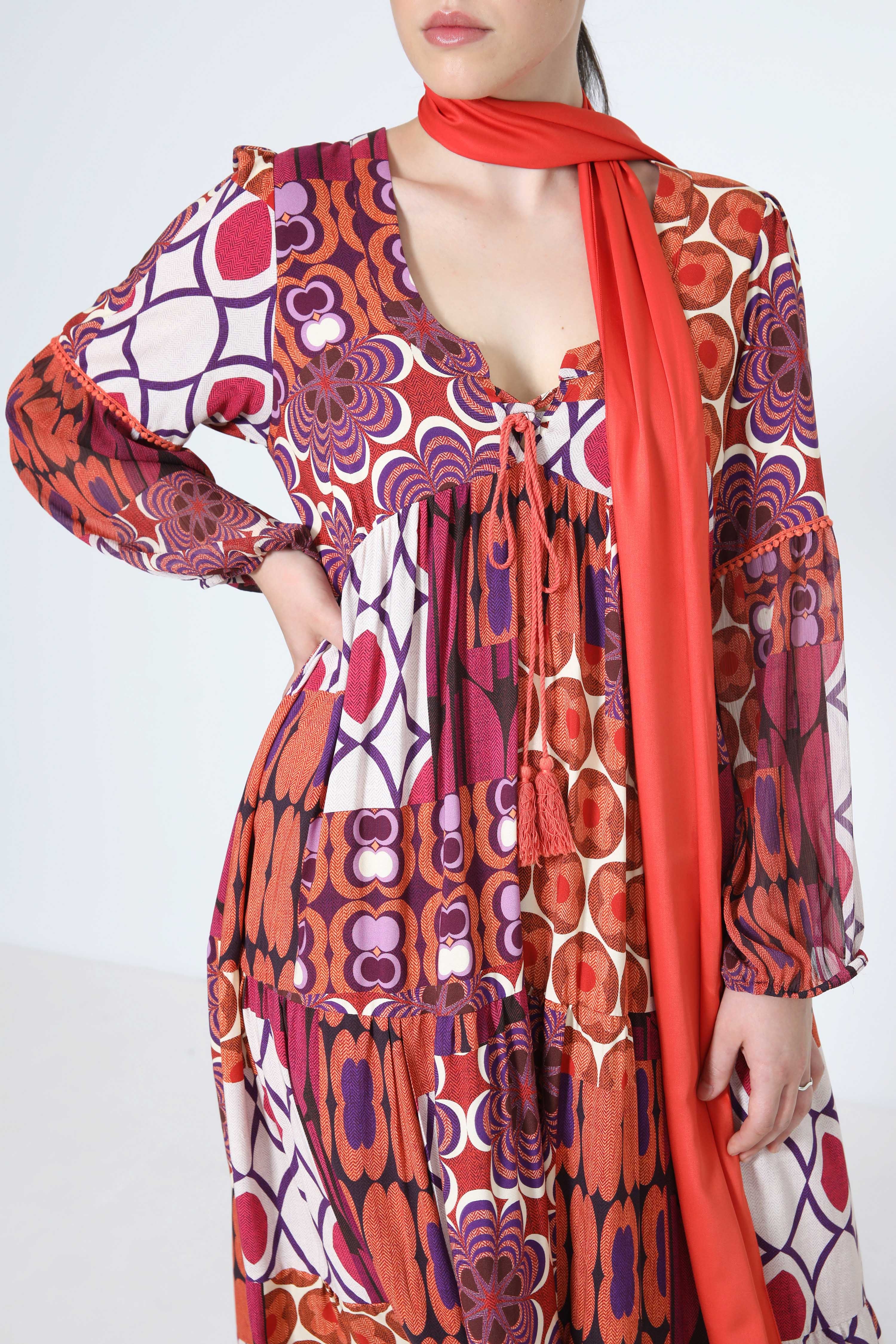 • Manche 3/4 fini par une découpe en voile imprimé bordé d'un galon uni.