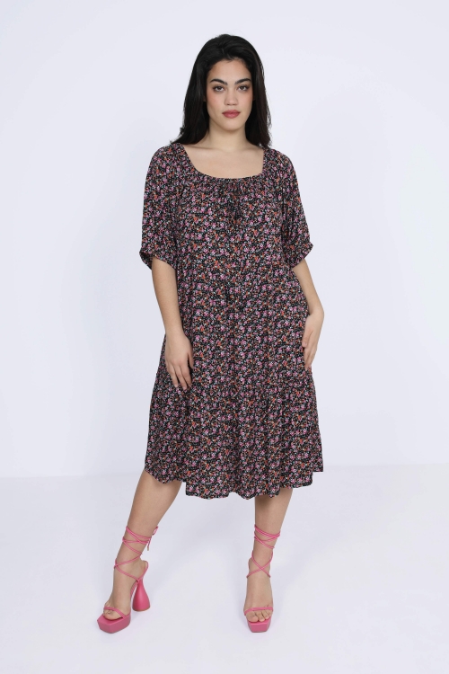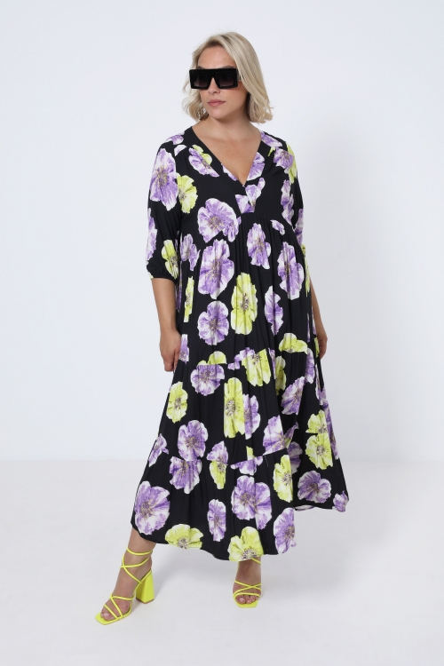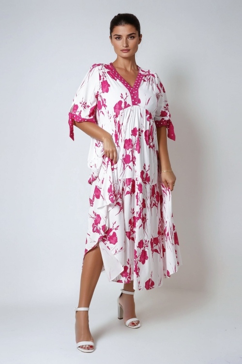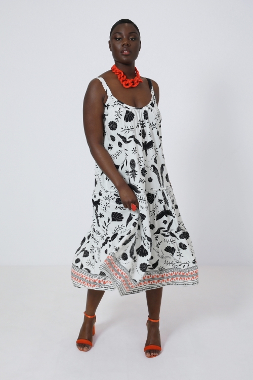 Détails produit :Robe midi en imprimé “tache”.Encolure en V.Patte de boutonnage.Boutonnage jusqu'au bas.Découpe empire.Le bas de robe est fait de deux volants froncés.Manche ¾ avec bracelet.Bas de manche fini par un volant.Suggestion de look : sans indications spécifiques, les accessoires ne sont pas inclus avec ce produit.