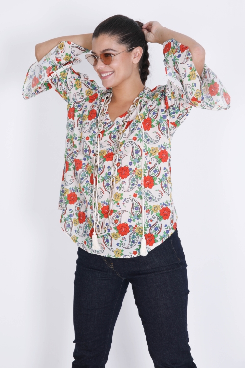 Détails produit : Blouse imprimée. Encolure en V avec large patte bordée d'un galon ajouré. Manche 3/4 avec galon dans la découpe du bas. Découpe haut dos sur fronces. Bas de forme liquette. Suggestion de look: accessoires non inclus