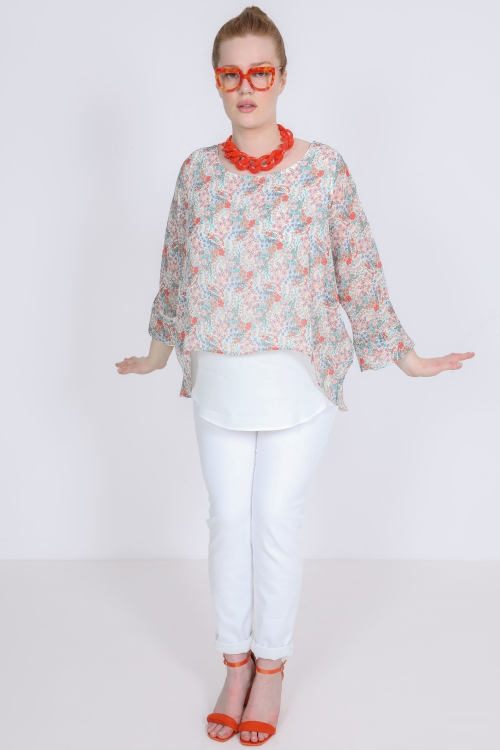 Détails produit :Blouse en voile imprimée.Doublée d'un top à bretelles en maille côtelé unie.Top amovible.Encolure ronde avec une fente finie par un lien avec un pompon.Manche raglan avec fronces à l'encolure.Poignet large en maille côtelée avec boutons décoratif.Suggestion de look : sans indications spécifiques, les accessoires ne sont pas inclus avec ce...