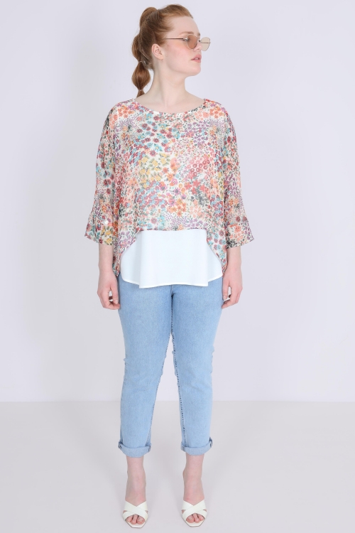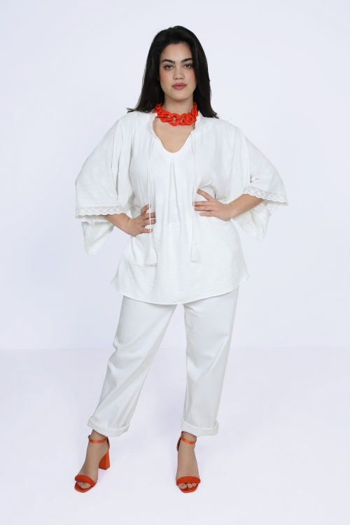 Coupe évasée et flatteuse ,parfaite pour sublimer toutes les silhouettes .Tissus fluide et leger .Double épaisseur dans le même tissus .Col v agrémenté de volants pour une touche féminine .Manches ¾ avec finition froncée pour un look raffiné .