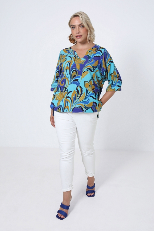 Détails produit :T-shirt bi matière.Effet superposition.Le haut est en maille côtelée unie.Encolure en V avec large bord.Le bas devant est satiné imprimé avec une fente au côté.Le dos est superposé.Le haut est en maille côtelée unie avec fente au milieu.Le dessous est satiné imprimé.Manche longue en maille côtelé fini par un large poignet satiné et...