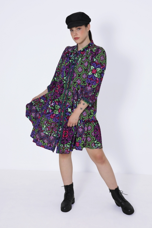 Détails produit :Robe midi en imprimé “tache”.Encolure en V.Patte de boutonnage.Boutonnage jusqu'au bas.Découpe empire.Le bas de robe est fait de deux volants froncés.Manche ¾ avec bracelet.Bas de manche fini par un volant.Suggestion de look : sans indications spécifiques, les accessoires ne sont pas inclus avec ce produit.