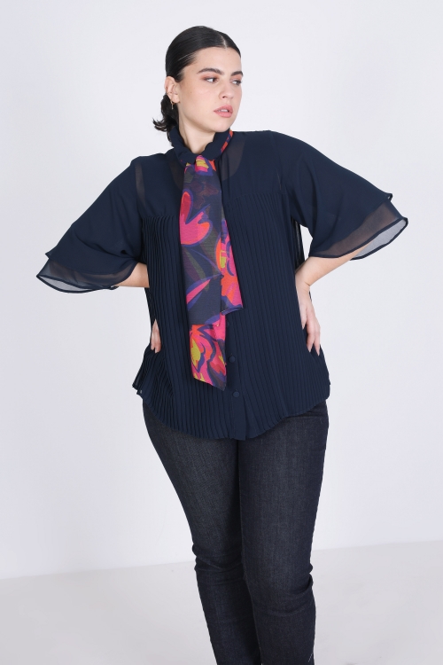 Apportez fraîcheur et modernité à votre dressing avec le chemisier “Bleu Fusion”, une pièce fluide et audacieuse en voile de viscose légère. Son jeu d’imprimés coordonnés – un floral XXL en façade et un motif tie & dye effet aquarelle sur les manches – crée une silhouette artistique et pleine de caractère. Le col légèrement montant...