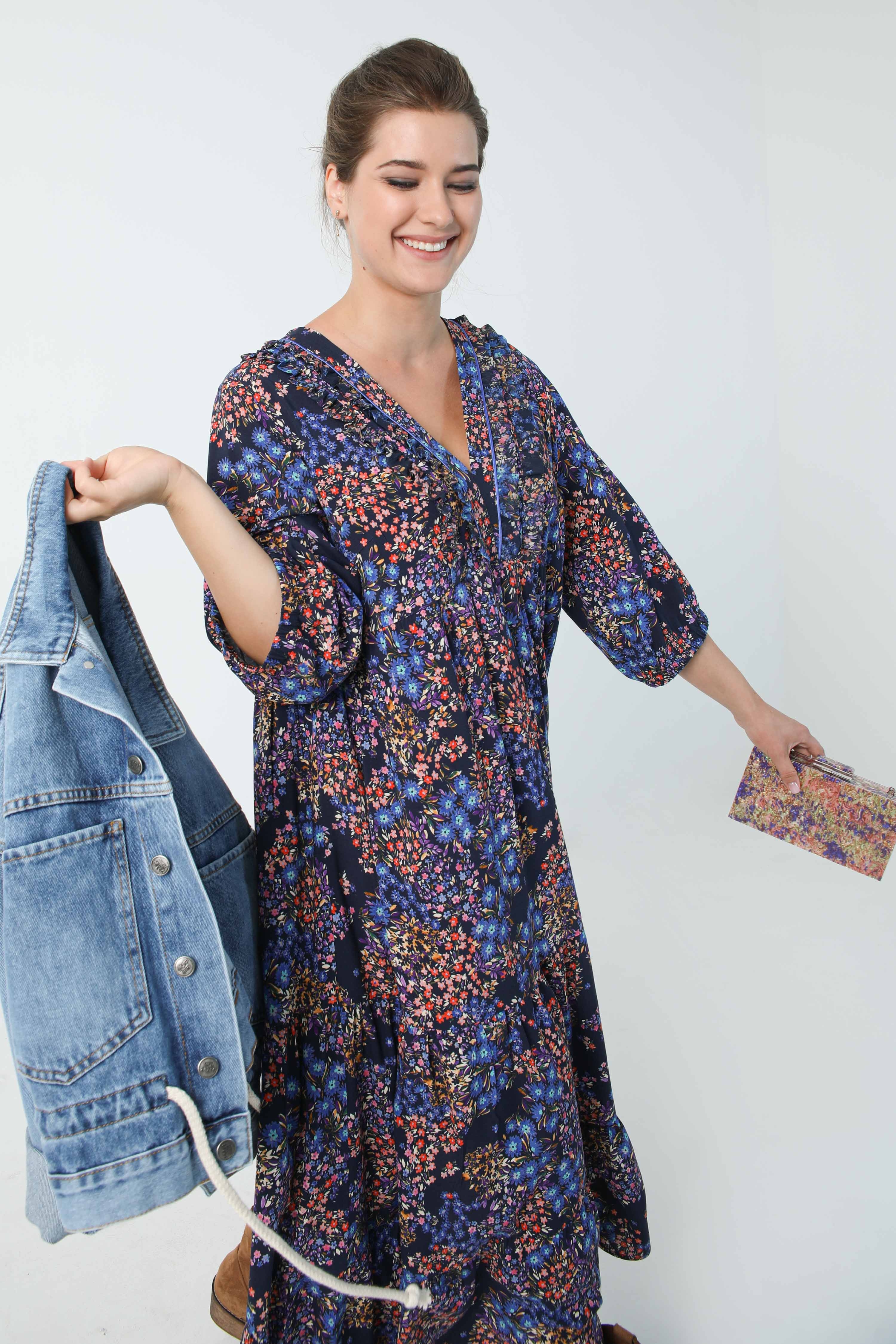 • Encolure en V avec patte bordée d'un passepoil uni.